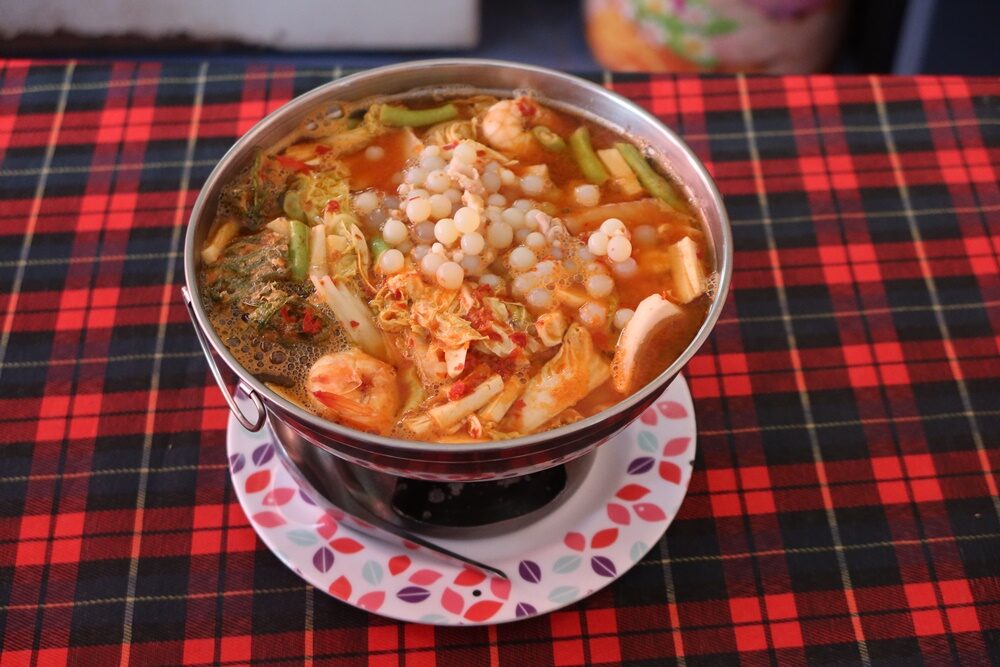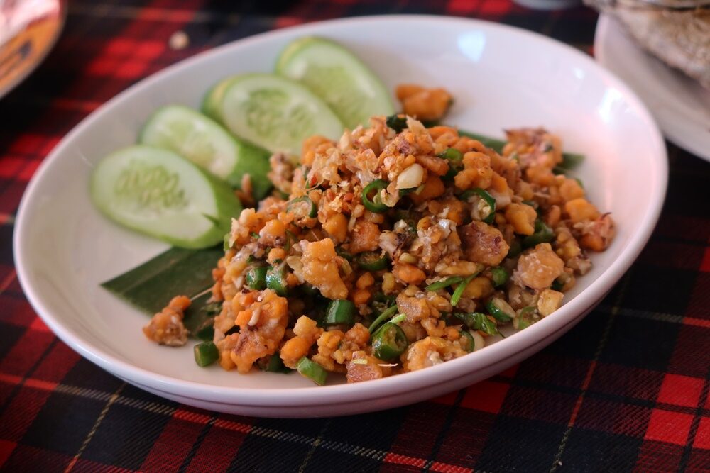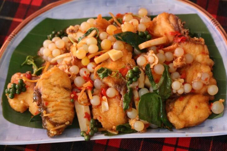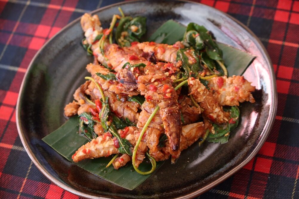 แนะนำว่าให้มากันหลายๆ คนจะได้สั่งเป็นกับข้าว วันนั้นมีไข่ปลาเรียวเซียวเพิ่งแกะเยื่อและล้างทำความสะอาดมาสดๆ ทำเป็นแกงส้มไข่ปลาเรียวเซียวกับกุ้งทะเล (150 บาท) ใส่ผักรวมและชะอมชุบไข่ทอด เจ้เก่ง น้องสาวเจ้จิ๊วทำเครื่องแกงได้รสเข้มข้นถูกใจเหมือนกินสมัยเด็กๆ