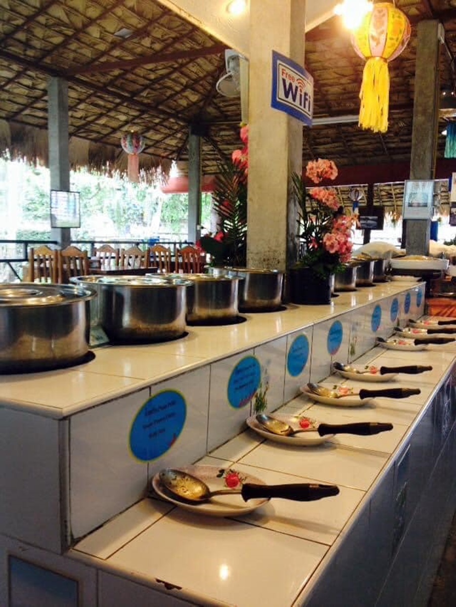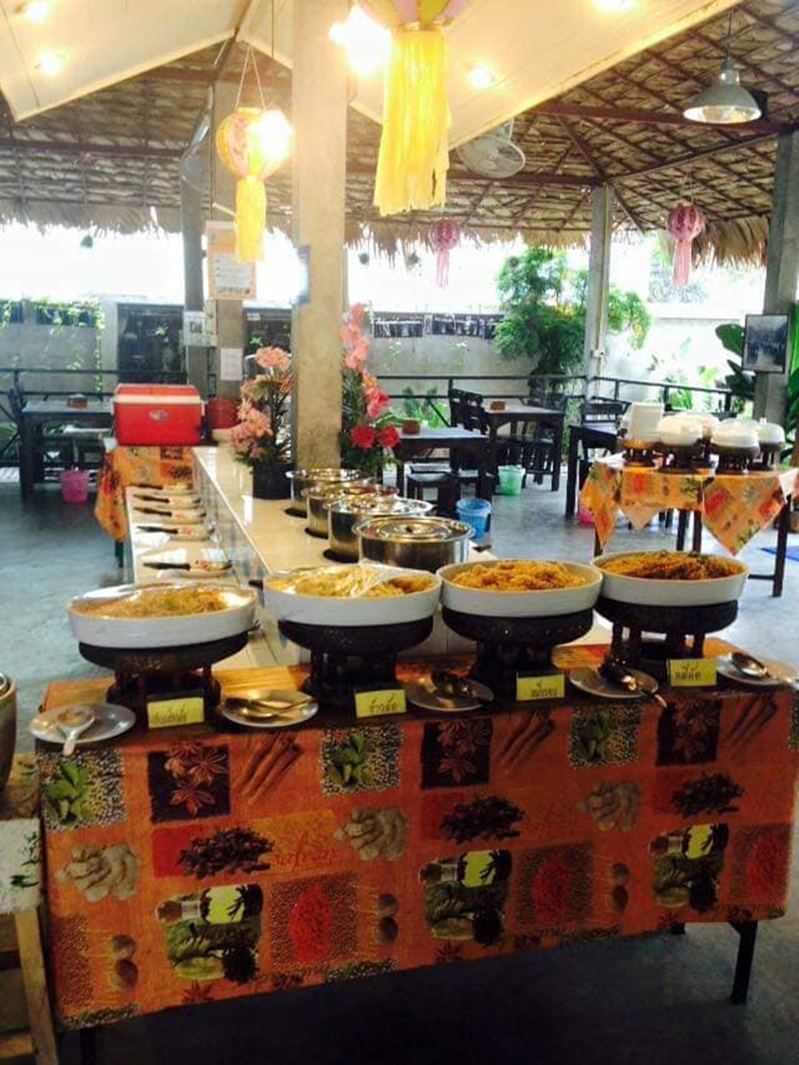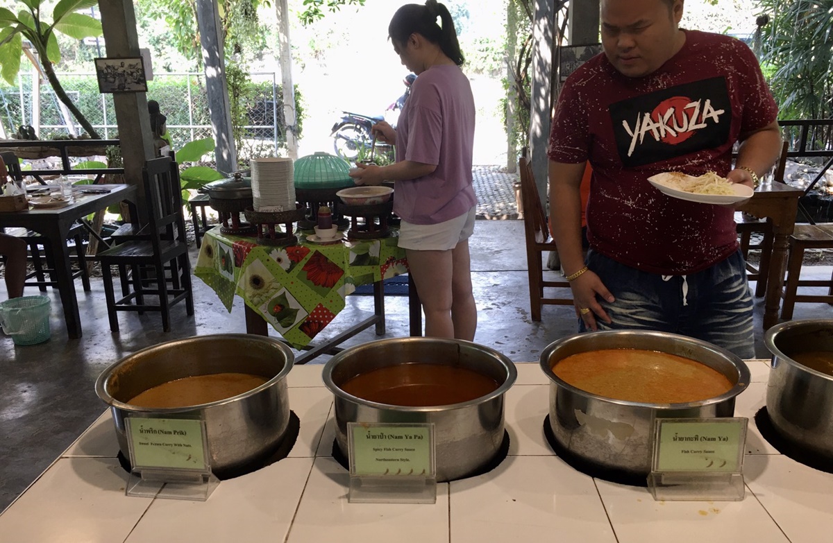 ร้านนี้เขาขายขนมจีนแบบบุฟเฟ่ต์ ราคาหัวละ 90 บาท ใครอยากกินเท่าไหร่ก็กินได้ กินไปเลย เติมได้ตลอด โดยทางร้านจะจัดวางน้ำขนมจีนไว้ซุ้มหนึ่ง มีทั้งหมด 8 น้ำ ได้แก่ น้ำยากะทิ น้ำยาป่า น้ำพริก แกงเขียวหวานหน่อไม้ แกงเขียวหวานมะเขือเปราะ แกงไตปลา น้ำเงี้ยว และขนมจีนซาวน้ำ ซึ่งหากินได้ยาก เพราะไม่ค่อยมีคนทำ