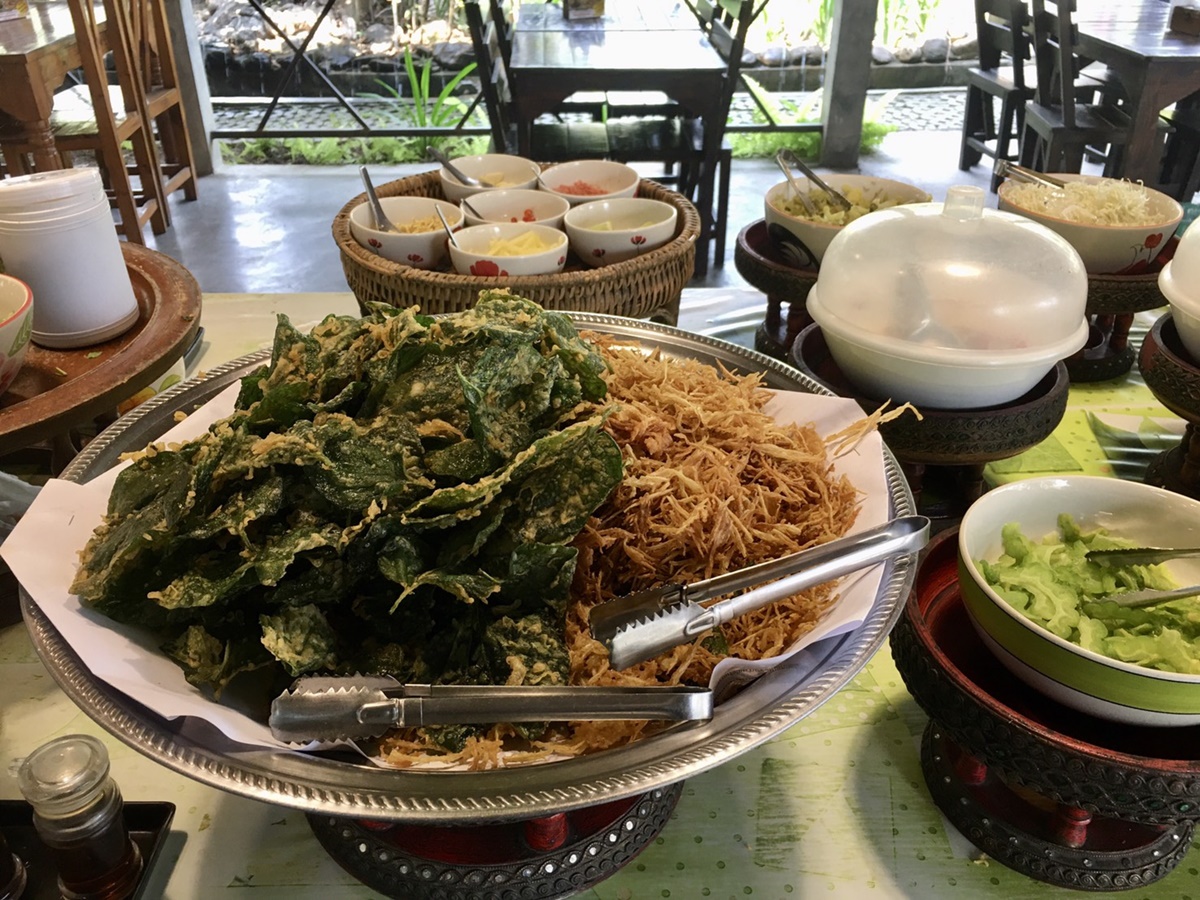 สำหรับรสชาตินั้น บอกได้เลยว่ากลมกล่อมลงตัวมากแทบไม่ต้องเติมอะไรอีก ยิ่งซาวน้ำด้วยแล้ว ยกนิ้วให้เลย กะทิสดใหม่ หอมมัน แต่ถ้าเป็นคอขนมจีนรสจัดจ้าน อาจจะยังแซ่บไม่พอ เพราะรสชาติของทางร้านเขาจะออกนวลๆ เนียนๆ แบบคนเหนือ ถ้าชอบเผ็ดก็มีพริกป่นให้ปรุงเพิ่มเติม ที่อร่อยแนะนำเลย คือ น้ำเงี้ยว รสชาติเป๊ะ ทั้งเลือดทั้งซี่โครงหมูนุ่มเคี้ยวกรุ๊บๆ ใครชอบน้ำเงี้ยวรับรองไม่ผิดหวัง ส่วนน้ำพริกก็ใช้ได้ แค่หวานไปนิดหนึ่ง นอกจากนี้ ยังมีอาหารเรียกน้ำย่อยไว้บริการเสริมให้ด้วย เรียกว่าตักกินได้ฟรีไม่มีคิดตังค์ ส่วนจะเป็นอะไรนั้นขึ้นอยู่กับทางร้านว่าจะนำเสนออะไร วันที่ไปมีส้มตำปูปลาร้า ส้มตำไทย ผัดไทย ทุกอย่างภายในร้านดูเขาทำอย่างพิถีพิถัน ใส่ใจแท้จริง