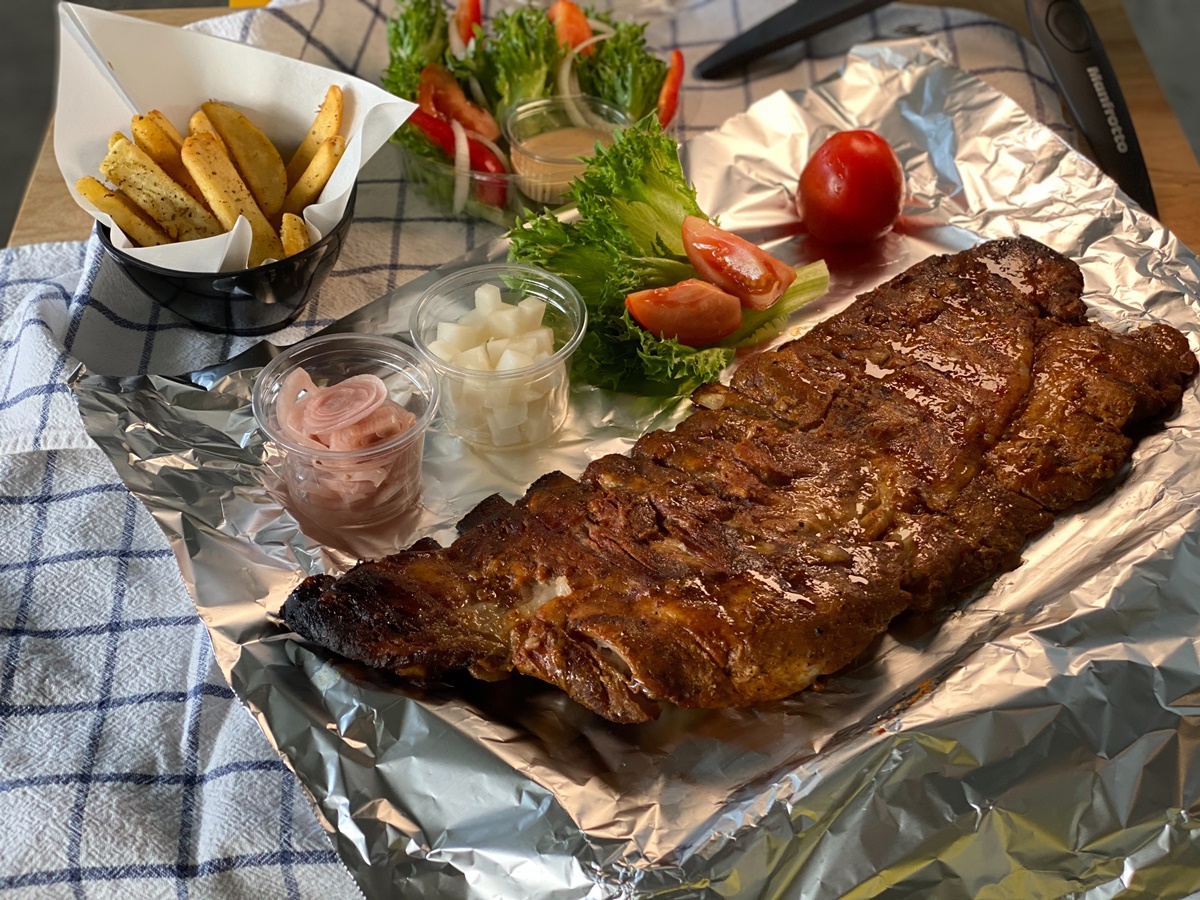 “ลงตัวที่ทำสเต๊ก เพราะที่ตลาดยังไม่มีร้านไหนขาย และเราควบคุมวัตถุดิบได้ง่าย เก็บได้ แต่มีข้อแม้ว่าถ้าขายไม่ได้ ต้องกินเองได้ ดังนั้นของที่ใช้จึงต้องเป็นของดี แล้วไปลงตัวที่ใช้เนื้อไทยเกรดพรีเมียม แล้วได้เพื่อนฝูงที่จบจากเลอกอร์ดองเบลอ เคยทำงานร้านสเต๊กในแอลเอ สหรัฐอเมริกา มาช่วยคิดสูตรให้ทั้งหมด”