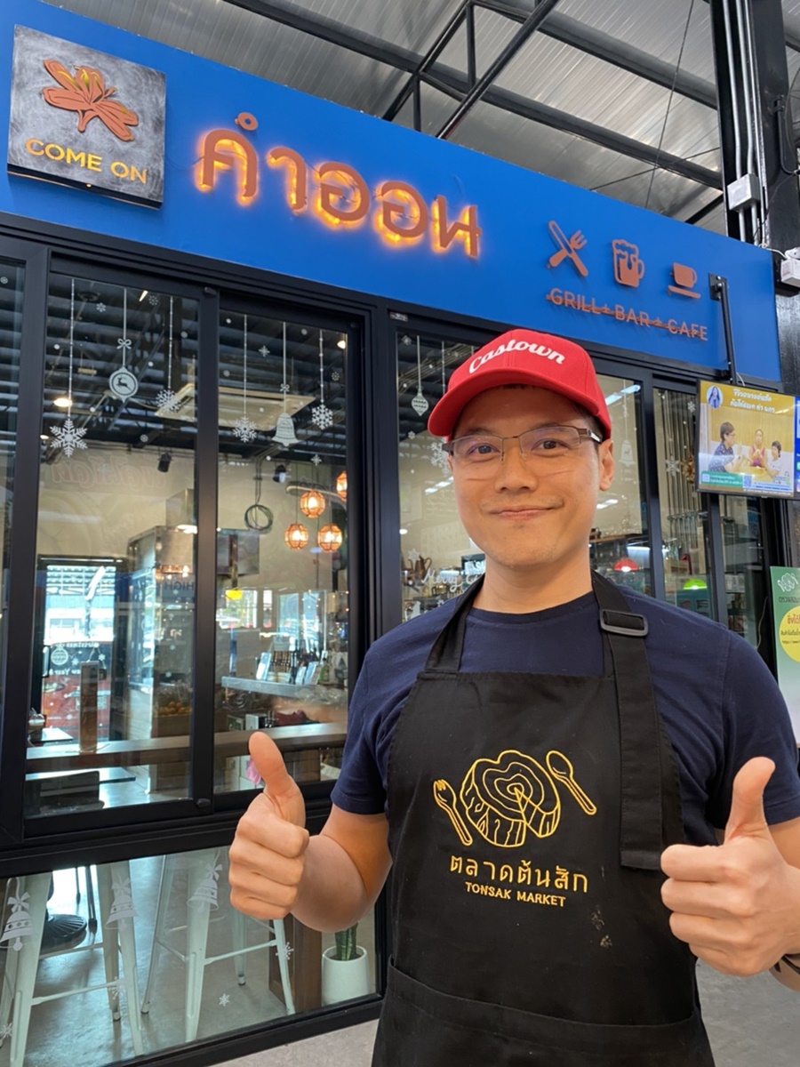 “ตาม-มั่นเกล้า คำวิเศษณ์” คนหนุ่มไฟแรง ตัดสินใจร่วมหุ้นกับเพื่อนอีกคนเล่าว่า เดิมทีงานหลัก คือ ดูแลบัญชีการเงินของบริษัทที่เกี่ยวกับระบบควบคุมอัตโนมัติในโรงงาน และ นอกเวลางานเป็นครูโยคะด้วย แต่หลังจากได้เห็นเพื่อนเปิดร้านทำข้าวคลุกน้ำพริกที่ตลาดนกฮูก ก็นึกสนุกอยากมีกิจกรรมบ้าง พอรู้ว่าตลาดต้นสักเปิดจึงเริ่มมาติดตามถามไถ่ จากเดิมแค่จะเปิดแผงเล็กๆ หาของมาแล้วขายไป ทำไปทำมาได้เป็นห้องแล้วมองหาว่าจะขายอาหารอะไร ได้ข้อสรุปที่ทำสเต๊ก และ แฮมเบอร์เกอร์
