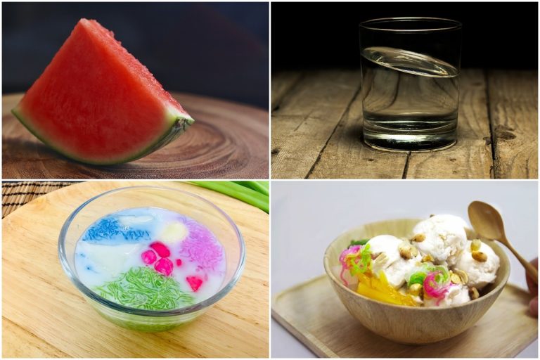 - น้ำเปล่า เป็นเครื่องดื่มที่หาง่ายได้ทั่วไป น้ำเปล่าเป็นสิ่งที่จำเป็นต่อร่างกายของเรา มีส่วนช่วยในระบบย่อยอาหาร รักษาระดับเกลือแร่ และอุณหภูมิในร่างกายของเราให้อยู่ในระดับปกติ ซึ่งอากาศร้อนๆ แบบนี้ทำให้เราสูญเสียน้ำไปกับเหงื่อค่อนข้างมาก ดังนั้นจึงขอเสนอ น้ำเปล่าให้เป็นตัวเลือกแรกๆ ของอาหารแก้กระหาย คลายร้อนนี้ หรืออาจต้มน้ำสมุนไพรดื่มเอง เช่น ใบเตยเก็กฮวย เพื่อแต่งกลิ่น อาจเติมน้ำตาลได้เล็กน้อย เพื่อเพิ่มความสดชื่นให้กับร่างกาย