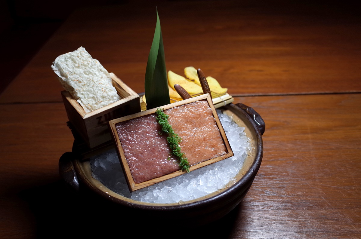 อีกหนึ่งเมนูซิกเนเจอร์ที่ต้องสั่ง คือ “ทาท่าร์ปลาทูน่าและปลาแซลมอน” (Salmon and tuna tartare with rice crackers) 680++ บาท เมนูนี้เป็นอะไรที่ดูเรียบง่าย แต่อร่อยมาก วิธีรับประทานคือตักปลาขึ้นมากินกับแครกเกอร์ หรือ แผ่นมันฝรั่งหวานทอด