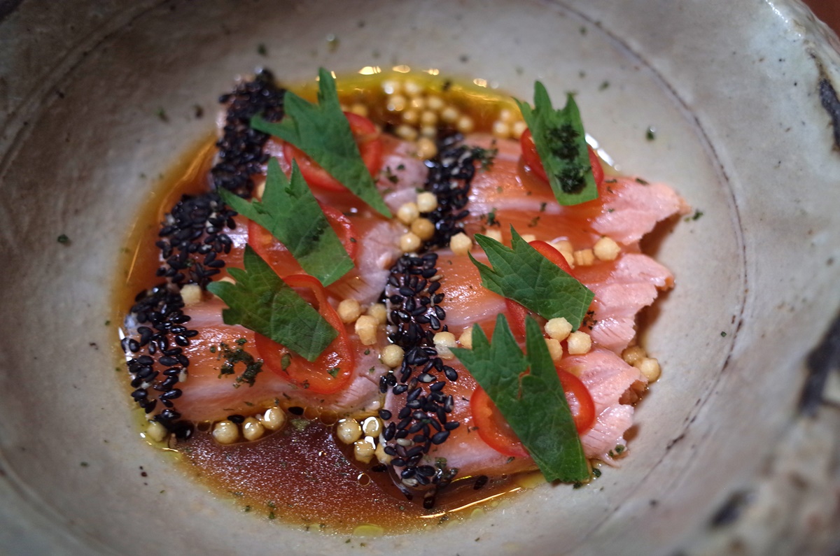 “ปลาแซลมอลแล่บางราดซอสซิโซ” (Seared salmon with lime shiso soy) 360++ บาท