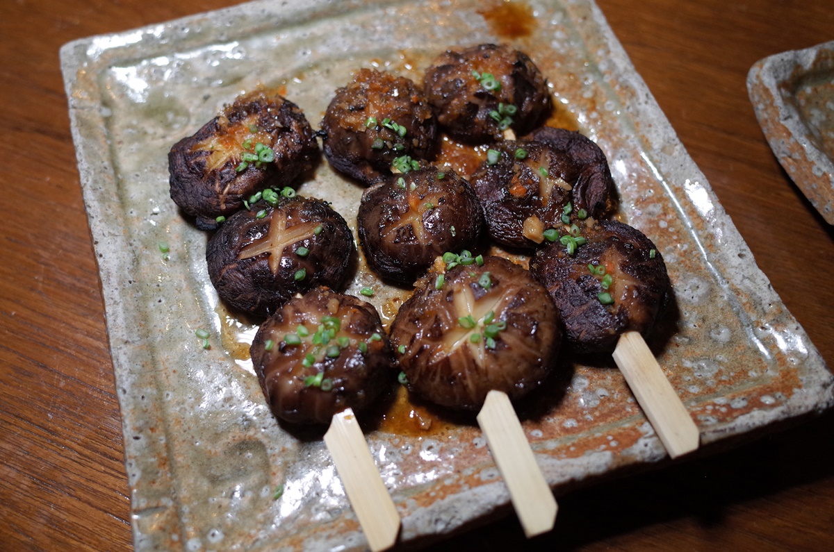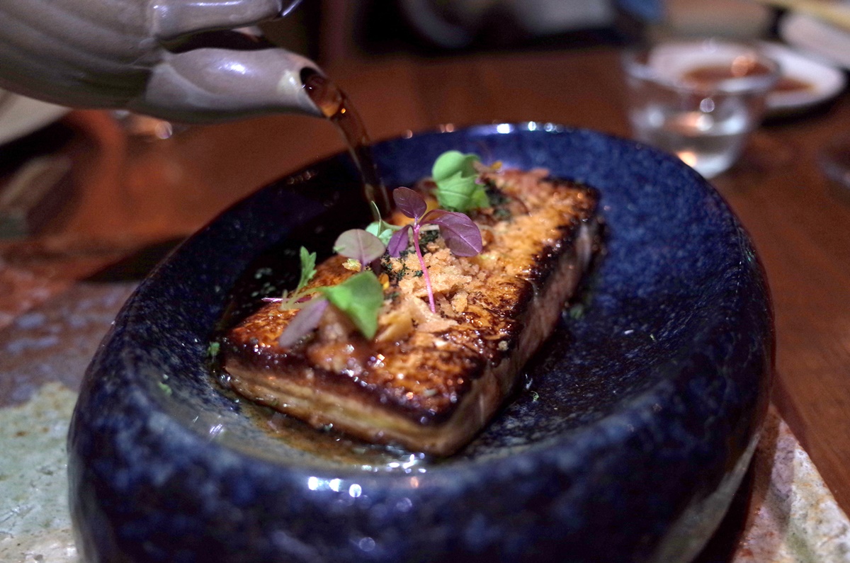 เริ่มจาก “เต้าหู้รมควันย่างราดมิโซะรสเผ็ดและซอสเท็นซุยุ” (Grilled tofu with spicy miso and mushroom tentsuyu sauce) 390++ บาท