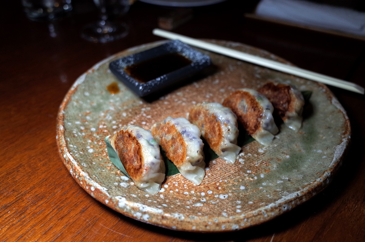 ต่อด้วย “เกี๊ยวซ่าไส้ปลาแบล็คค้อดและกุ้ง” (black cod and prawn gyoza with spicy ponzu sauce) 450++ บาท