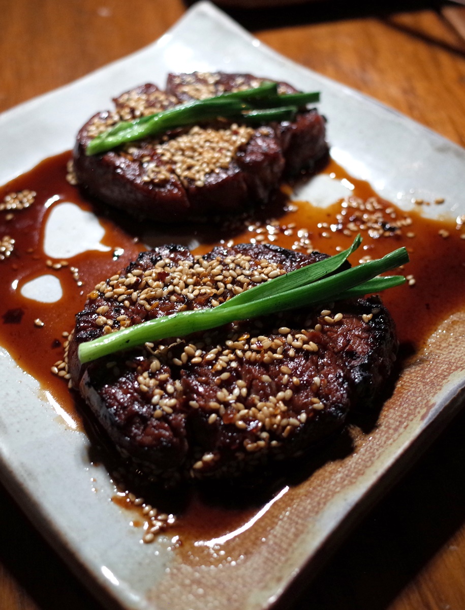 “เนื้อสันในย่างราดซอสเผ็ดหวานโรยด้วยต้นหอม” (Spicy beef tenderloin, sesame, red chilli and sweet soy) 1,340++ บาท ตัวนี้เป็นเทนเดอลอยน์จากออสเตรเลีย