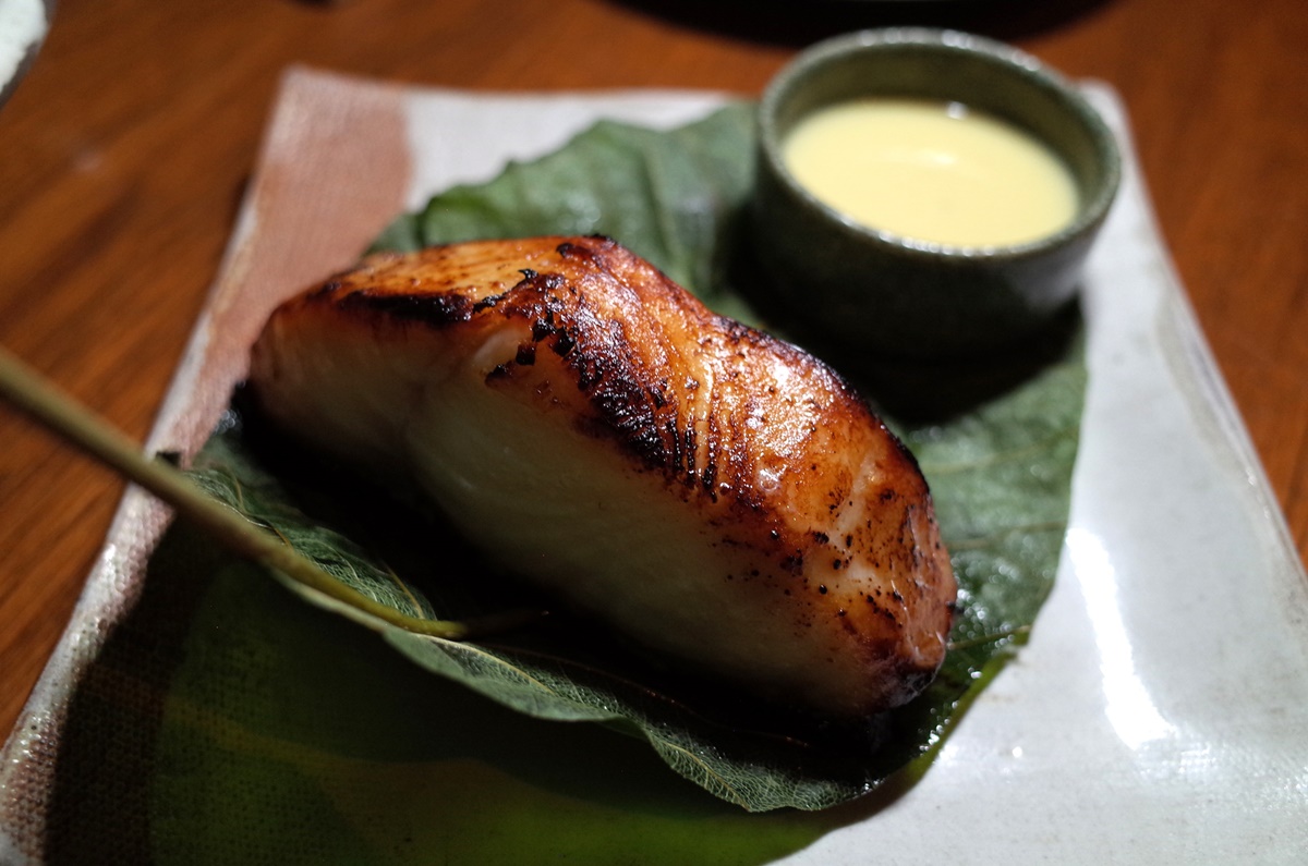 อีกซิกเนอเจอร์ที่น่าลิ้มลอง “ปลาแบล็คค้อดหมักมิโสะหวานเสิร์ฟพร้อมใบสักทอง” (Miso marinated black cod wrapped in hoba leaf) 1,520++ บาท ปลาคอดดำนี้บางทีคนไทยก็เรียกปลาหิมะ เพราะหน้าตาคล้ายๆ กัน เมนูนี้จะนำปลาไปหมักกับมิโสะถึง 4 วัน แล้วนำมาอบ วิธีรับประทานคีบเนื้อปลาออกมาเป็นเลเยอร์ได้เลย ซอสวาซาบิจะตัดกับมิโสะให้รสชาติเผ็ดหวาน