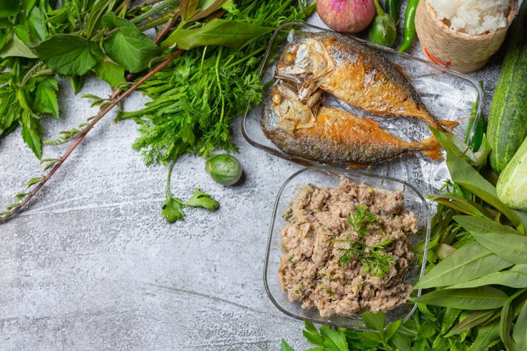 Fried Mackerel Chili Paste and Vegetable Set, Thai food.