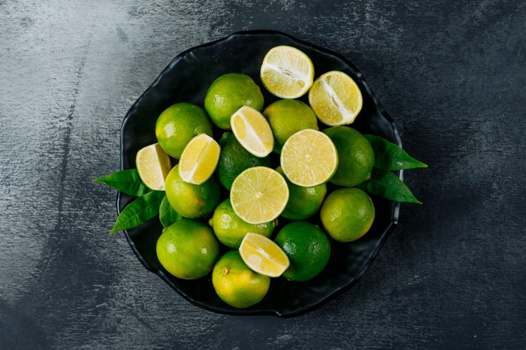 Green lemons in a plate with slices top view on a black textured background FacebookFacebookXTwitterLINELine