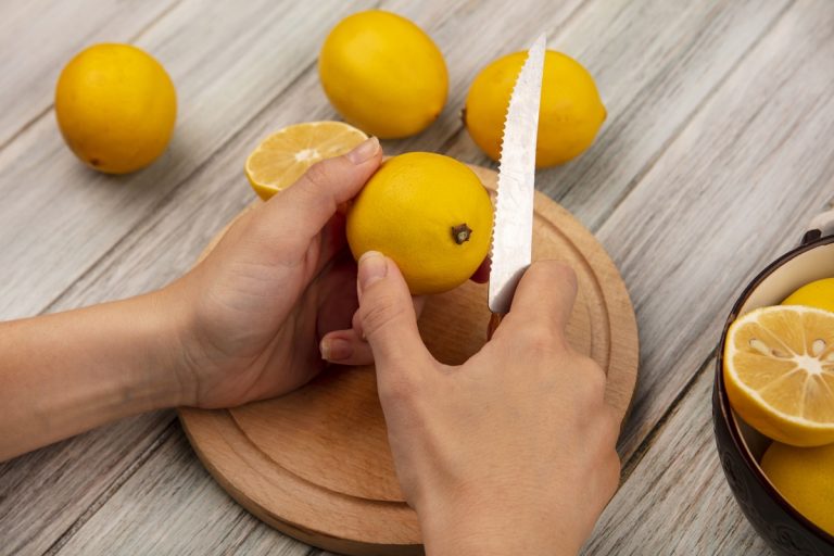 top view of female hands cutting fresh lemon on a wooden kitchen board with knife with lemons on a bowl with lemons isolated on a grey wooden background FacebookFacebookXTwitterLINELine