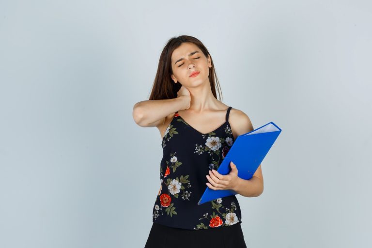 Portrait of young lady holding folder, having neck pain in blouse, skirt and looking fatigued front view FacebookFacebookXTwitterLINELine