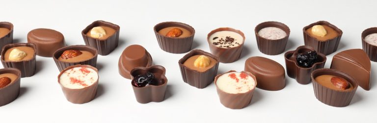 Flat lay composition with chocolate candies on white background