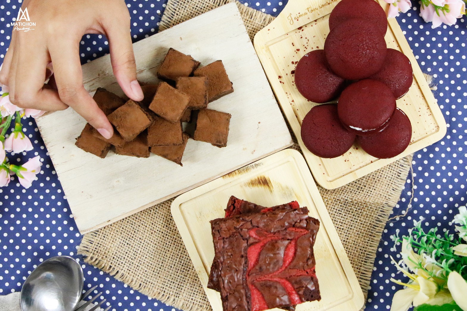Red Velvet Chocolate Brownie เป็นเนื้อบราวนี่แต่เป็นสีแดง มีกลิ่นหอมของช็อคโกแลต และจะมีความชุ่มฉ่ำกว่าบราวนี่ช็อกโกแลตทั่วไป