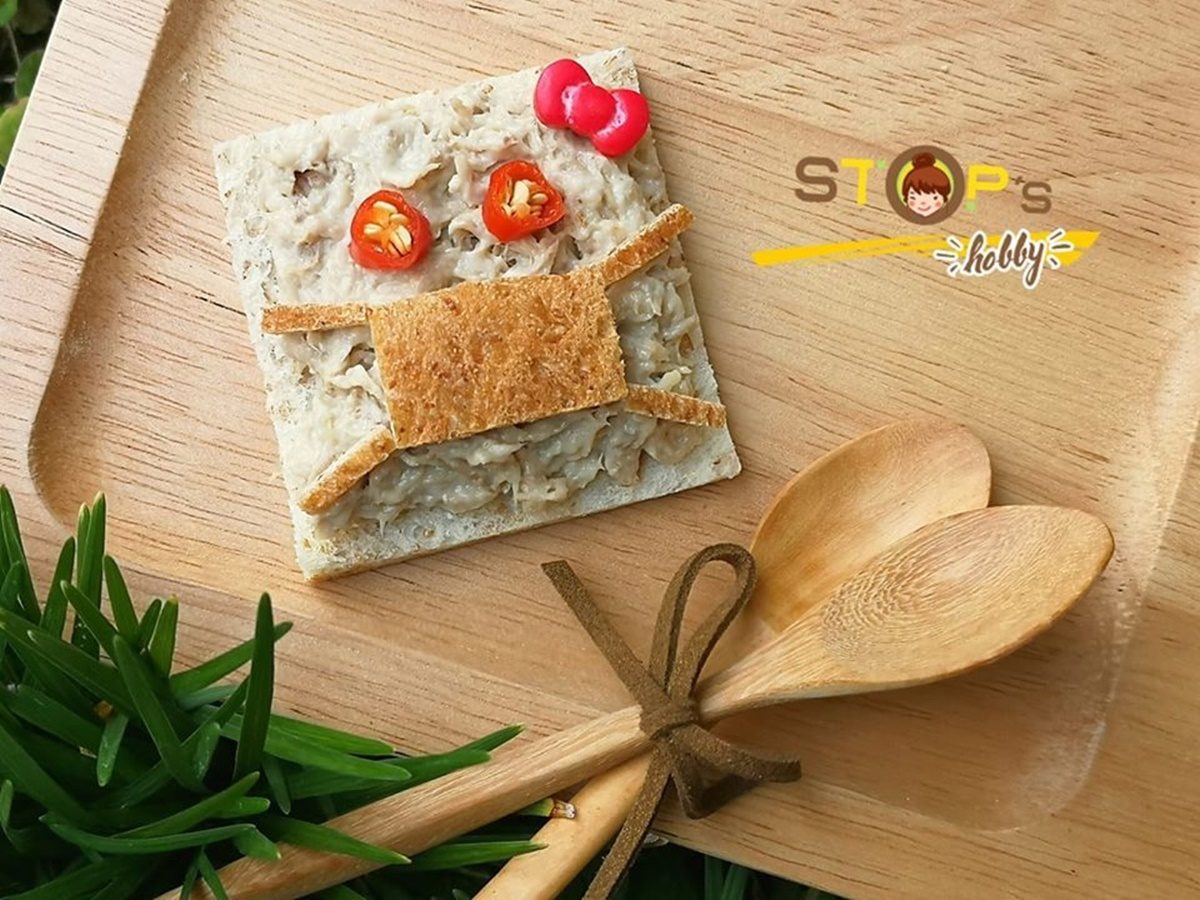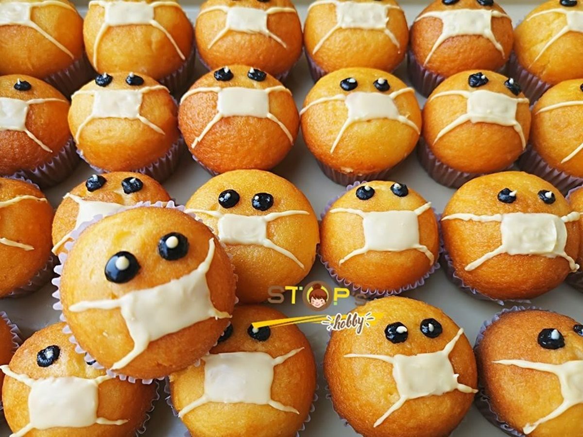 “ขนมไข่ ที่คล้ายเค้กกล้วยหอมนั้นรับมา ก่อนตกแต่งเพิ่ม โดยนำแท่งไวท์ช็อกโกแลต ที่ซื้อมาจากญี่ปุ่นนานแล้ว มาวาดเป็นรูปหน้ากาก วาดไปทั้งหมด 30 ชิ้น ปกติเป็นคนชอบจัดขนมตามธีมต่างๆ อยู่แล้ว และช่วงนี้มีสถานการณ์โควิด เลยลองทำออกมาดู ไม่คิดว่าคนจะชอบมากขนาดนี้ คงเพราะทำให้หลายคนยิ้มได้มั้งคะ” คุณต๊อป เล่าอย่างนั้น