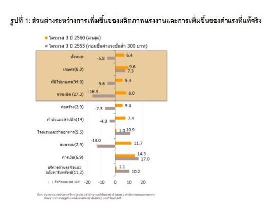 วิจัยกรุงศรีกล่าวในรายงานผลกระทบการขึ้นค่าแรงขั้นต่ำต่อเศรษฐกิจไทยว่า ในภาพรวมการปรับเพิ่มค่าแรงขั้นต่ำครั้งนี้ค่อนข้างสอดคล้องกับสถานการณ์เศรษฐกิจในแง่ของเวลา สาขาการผลิต และพื้นที่ หากพิจารณาจากส่วนต่างระหว่างการเพิ่มขึ้นของผลิตภาพแรงงาน (ผลผลิตต่อแรงงานหนึ่งหน่วย) กับการเพิ่มขึ้นของค่าแรงที่แท้จริง จะพบว่าในช่วงก่อนการปรับขึ้นค่าแรงขั้นต่ำสู่ 300 บาท การเพิ่มขึ้นของผลิตภาพแรงงานช้ากว่าการเพิ่มขึ้นของค่าแรงที่แท้จริง หรือส่วนต่างมีค่าเป็นลบ (รูปที่ 1) ในขณะที่สถานการณ์ปัจจุบัน (ข้อมูลล่าสุด ณ ปี 2560 ไตรมาส 3) ผลิตภาพแรงงานเพิ่มขึ้นเร็วกว่าค่าแรงที่แท้จริงหรือส่วนต่างมีค่าเป็นบวก ซึ่งสะท้อนว่ายังมีช่องว่างให้ปรับขึ้นค่าจ้างเพื่อให้สอดคล้องกับความสามารถในการผลิตของแรงงานที่เพิ่มขึ้น หากพิจารณาในแต่ละสาขาการผลิต พบว่าในปัจจุบันผลิตภาพแรงงานเพิ่มขึ้นเร็วกว่าค่าแรงที่แท้จริงในทุกสาขาการผลิต สอดคล้องกับภาพรวมของประเทศ และหากประเมินในแง่ของพื้นที่ (รูปที่ 2) พบว่าการขึ้นค่าแรงขั้นต่ำจะส่งผลให้ค่าแรงเฉลี่ยเพิ่มขึ้นในอัตราที่สอดคล้องกับการเติบโตของผลิตภาพแรงงานในแต่ละจังหวัด ดังนั้นการปรับขึ้นค่าแรงขั้นต่ำครั้งนี้จึงสะท้อนความสามารถด้านการผลิตของแรงงานที่เพิ่มขึ้นในช่วงเวลาที่ผ่านมา