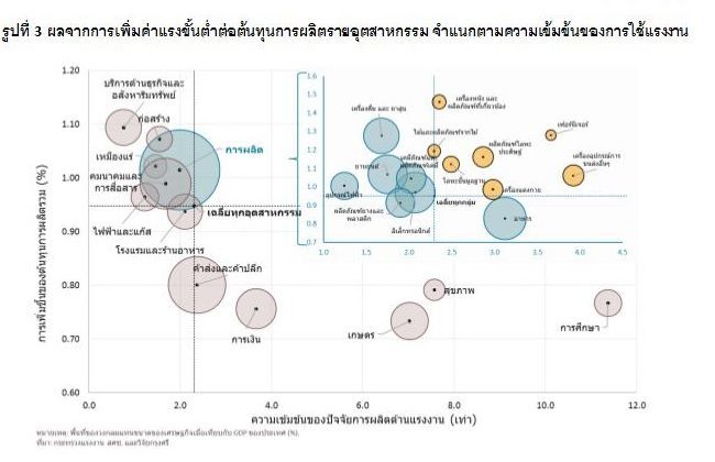ทั้งนี้ การเพิ่มขึ้นของต้นทุนการผลิตสามารถจำแนกผลกระทบเป็นสองส่วน ส่วนแรกคือ ผลกระทบทางตรงร้อยละ 0.13 ซึ่งเป็นผลจากการเพิ่มขึ้นของค่าจ้างเฉพาะปัจจัยการผลิตด้านแรงงาน ส่วนที่สองคือ ผลกระทบทางอ้อมร้อยละ 0.82 เป็นผลจากการเพิ่มขึ้นของราคาปัจจัยการผลิตอื่นๆ หรือเป็นการเพิ่มขึ้นของต้นทุนค่าแรงที่แฝงอยู่ในราคาสินค้าขั้นกลางและวัตถุดิบ นอกจากนี้ การเพิ่มขึ้นของต้นทุนการผลิตดังกล่าวคาดว่าจะส่งผ่านมายังราคาสินค้าผู้บริโภคร้อยละ 0.62 ซึ่งอาจจะมีส่วนช่วยผลักดันให้อัตราเงินเฟ้อที่ค่อนข้างต่ำในปัจจุบันให้ทยอยเข้าสู่กรอบเป้าหมายของธนาคารแห่งประเทศไทยได้ในช่วงกลางปีนี้
