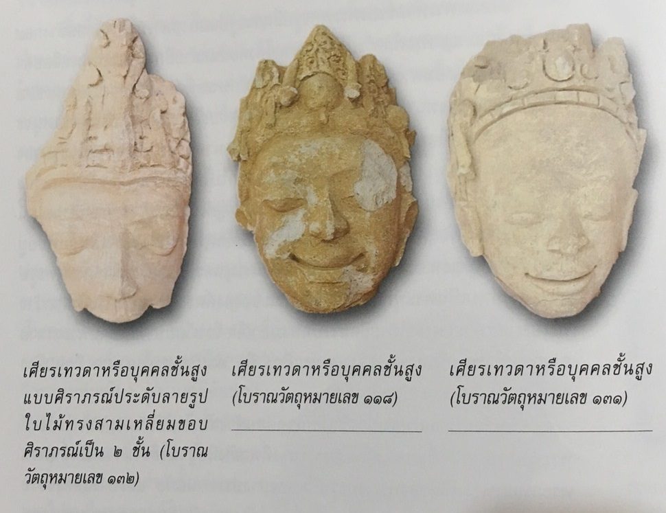 ประติมากรรมปูนปั้นรูปเทวดาหรือบุคคลชั้นสูง จำแนกเป็น ส่วนพระเศียร 74 ชิ้น และพระวรกาย 45 ชิ้น โดยพบว่าคงลักษณะรูปแบบที่มีอิทธิพลของศิลปะอินเดีย สมัยราชวงศ์คุปตะและหลังคุปตะ เช่น พระพักตร์รูปไข่ พระขนงโก่งต่อกันเป็นรูปคล้ายปีกกา พระเนตรเหลือบต่ำ พระนาสิกโด่ง พระโอษฐ์แย้มเล็กน้อย สวมศิราภรณ์ประดับลาย พันธุ์พฤกษา กรองศอ และกุณฑล พระวรกายมีลักษณะพระอังสาใหญ่ พระอังสกุฏ(ไหล่)โค้ง พระอุระแบนหนา พระวรกายยืดยาว บั้นพระเอวคอด มีพระอันตคุณ(พุง) เล็กน้อย พระนาภีเป็นรูกลม