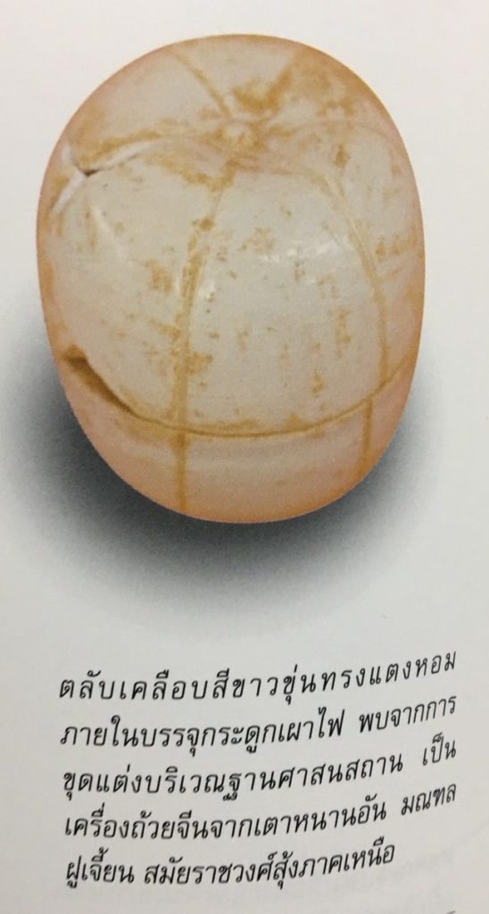 ที่น่าสนใจ คือ ตลับรูปแตงหอม เนื้อกระเบื้องเคลือบสีขาวขุ่นผลิตจากประเทศจีน ลักษณะของน้ำเคลือบบาง เห็นรอยแป้นหมุนที่ด้านนอกเป็นวงๆ การพบหลักฐานเรื่องถ้วยเคลือบสีขาวขุ่นที่ผลิตจากประเทศจีน จึงเป็นข้อมูลสำคัญอีกประการหนึ่งแสดงถึงวัตถุที่ถูกนำเข้ามาโดยการค้าขายแลกเปลี่ยนสินค้าระหว่างชุมชนโบราณในบริเวณนี้กับพ่อค้านักเดินเรือชาวจีน ภายในตลับรูปแตงหอมบรรจุอัฐิสะท้อนถึงพิธีกรรม ความเชื่อเกี่ยวกับความตาย