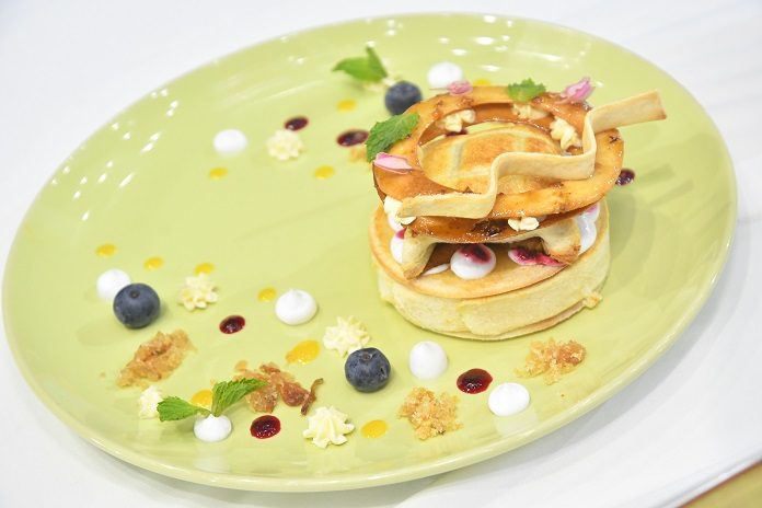 วรภัทรบอกว่า เมนูจานนี้ประกอบไปด้วย 4 ส่วน คือ แอปเปิลดูโอ้ ซึ่งใช้แอปเปิลเขียวเป็นวัตถุดิบหลักบดผสมกับเกล็ดขนมปัง มีลักษณะเหมือนขนมสอดไส้ผลไม้อย่างลูกเกดและแครนเบอรี่ ต่อมาคือโทสต์ดูโอ้ที่เป็นขนมปังปิ้งทานคู่กับเกล็ดขนมปังดูโอ้ที่ใช้ตกแต่ง จาน สุดท้ายคือครีมมี่ดูโอ้ซึ่งเป็นขนมสอดไส้ครีมจากไข่ไก่ตีคู่กับน้ำตาลเพื่อ ทดแทนนมข้นหวาน ซึ่งรายการทั้งหมดนี้ถูกออกแบบให้ขนมทุกชิ้นมีรสชาติที่มีความเข้ากัน