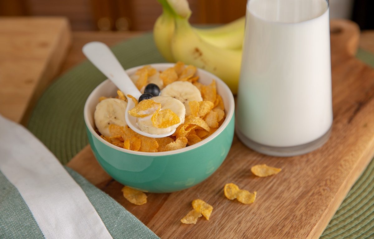 เพียงแค่เทคอร์นเฟลกหรือซีเรียลลงถ้วย ใส่นมสดเย็นๆ เติมกล้วยหอมและผลไม้อื่นๆ แค่นี้ก็ได้อาหารเช้าที่มีคุณค่าทางโภชนาการและอร่อยด้วยนะ