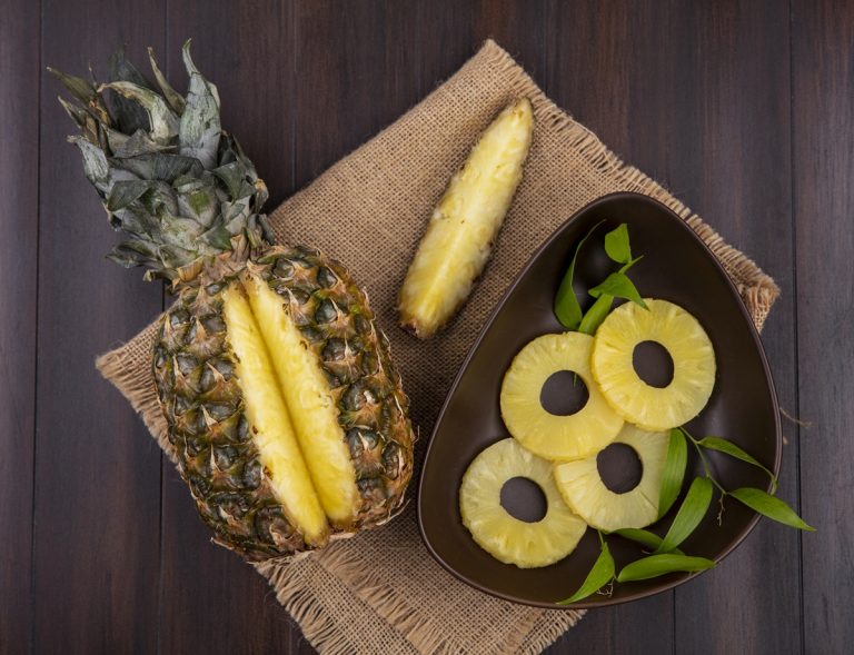 top view of pineapple with one piece cut out from whole fruit and bowl of pineapple slices on sackcloth and wooden background FacebookFacebookXTwitterLINELine