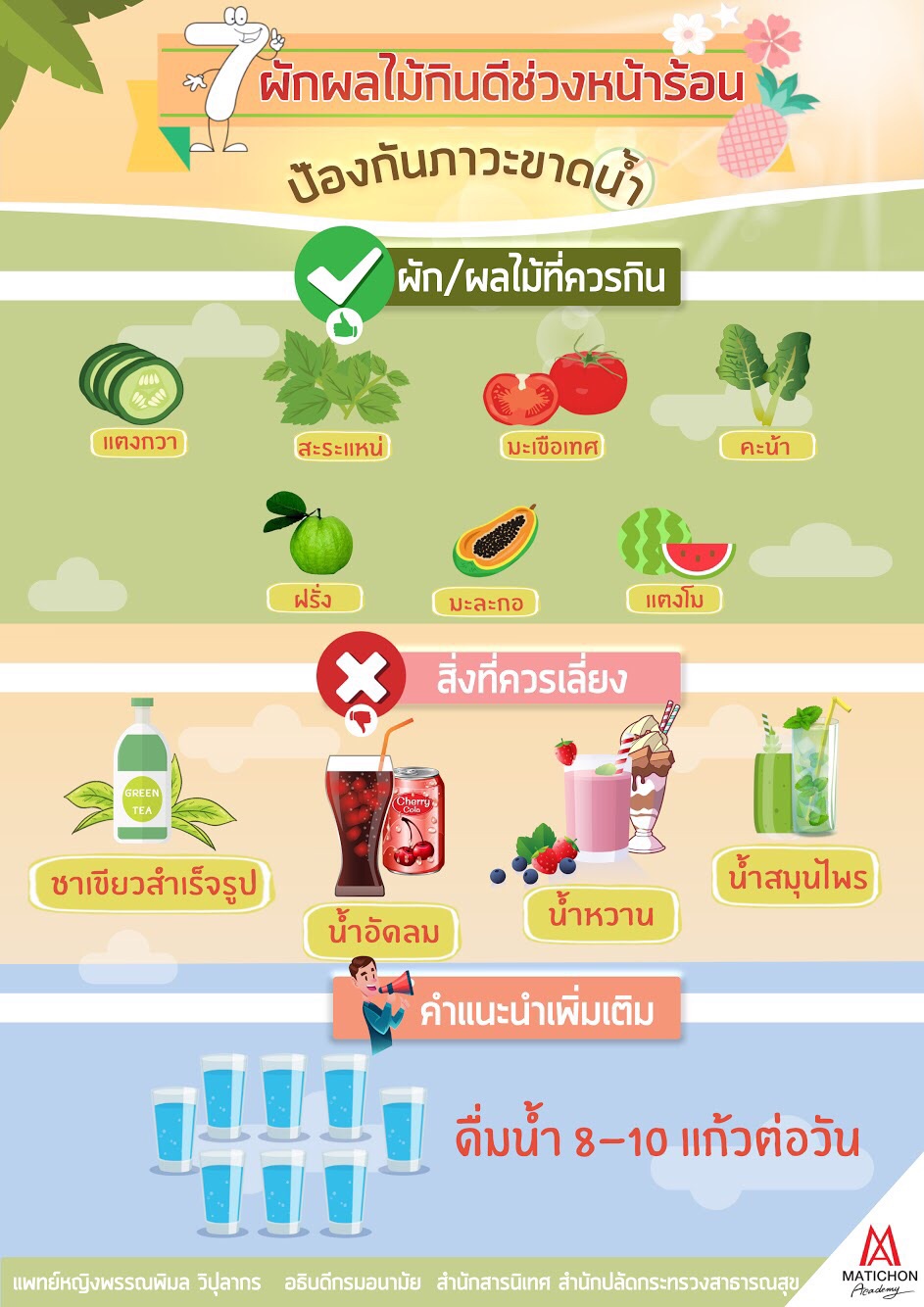 ช่วงหน้าร้อนอาจทำให้ร่างกายอ่อนเพลีย เกิดภาวะขาดน้ำได้ จึงควรดื่มน้ำเปล่าอย่างน้อย 8 – 10 แก้วต่อวัน นอกจากนี้ ยังควรกินผัก ผลไม้ ที่มีส่วนประกอบของน้ำด้วย ส่วนผักผลไม้ที่มีฤทธิ์เย็น มีส่วนประกอบของน้ำเยอะ จะมีอะไรบ้าง ไปดูกัน