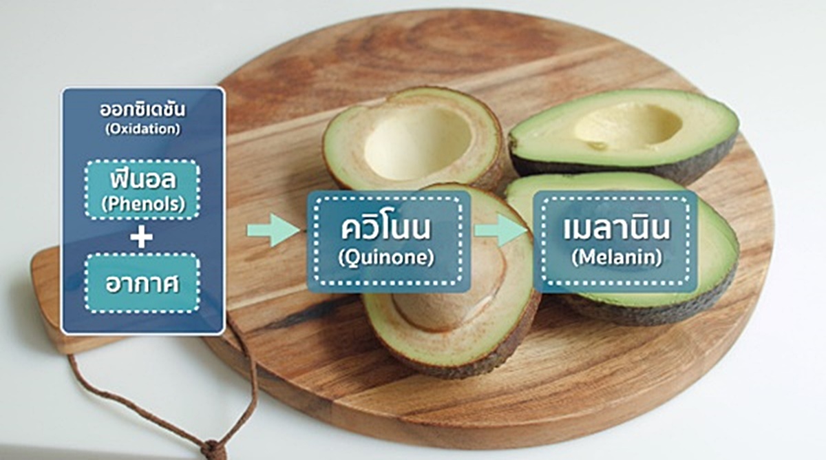 อะโวคาโดก็เหมือนผลไม้หลายๆ ชนิด ที่ถึงแม้จะเก็บไว้ในตู้เย็น ก็อาจทำให้สีของเนื้อเปลี่ยนไปเป็นสีน้ำตาล เพราะเนื้อผลไม้จะเกิดปฏิกิริยาออกซิเดชั่น ที่เกิดจากสารประกอบที่อยู่ในอะโวคาโดที่เรียกว่า ฟินอล เจอกับอากาศ กลายเป็นสารประกอบที่มีชื่อว่า ควิโนน เมื่อควิโนนจับตัวกันเป็นโพลีเมอร์ที่มีโมเลกุลใหญ่ขึ้น ก็จะเกิดเป็นเม็ดสีที่เรียกว่า เมลานิน นั่นเอง