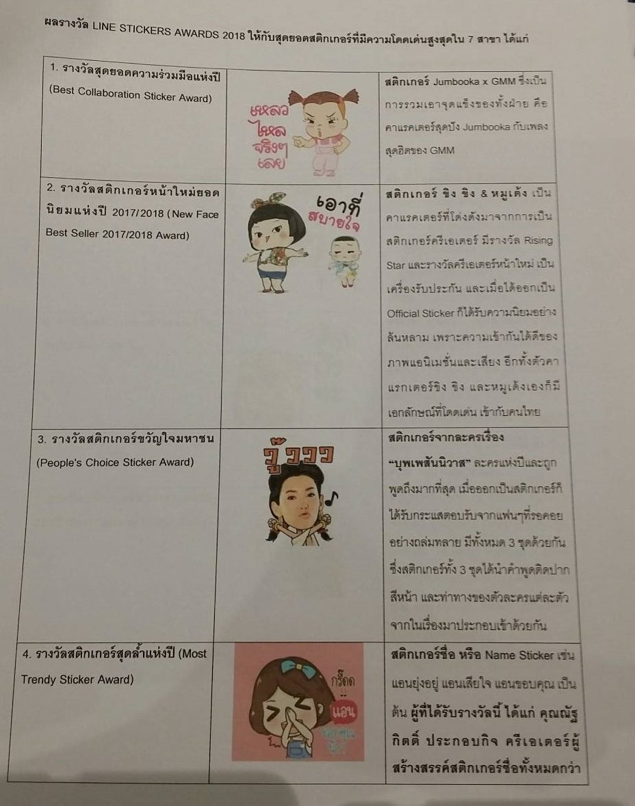 ทั้งนี้ ไลน์ยังได้จัดงานมอบรางวัล “LINE Stickers Awards 2018” โดยมีครีเอเตอร์ที่สร้างผลงานสติ๊กเกอร์ที่มีความโดดเด่นสูงสุดใน 7 สาขา ได้แก่ 1.รางวัลสุดยอดความร่วมมือแห่งปี ได้แก่ สติ๊กเกอร์ Jumbooka x GMM 2.รางวัลสติ๊กเกอร์หน้าใหม่ยอดนิยมแห่งปี 2017/2018 ได้แก่ สติ๊กเกอร์ ขิง ขิง & หมูเด้ง 3.รางวัลสติ๊กเกอร์ขวัญใจมหาชน ได้แก่ สติ๊กเกอร์จากละครเรื่อง “บุพเพสันนิวาส”