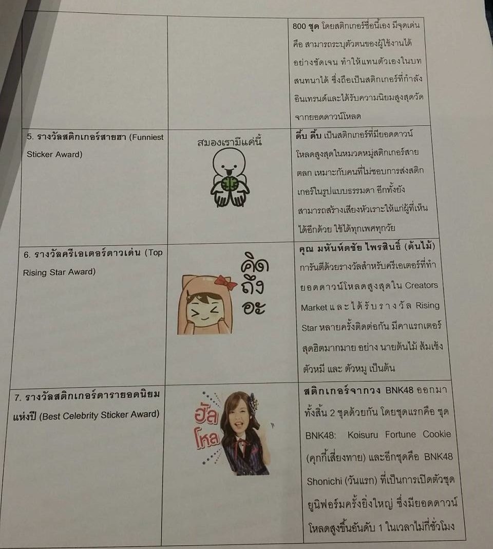 4.รางวัลสติ๊กเกอร์สุดล้ำแห่งปี ได้แก่ สติ๊กเกอร์ชื่อ หรือ Name Sticker โดยผู้ที่ได้รับรางวัลนี้ ได้แก่ “ณัฐกิตติ์ ประกอบกิจ” ครีเอเตอร์ผู้สร้างสติ๊กเกอร์ชื่อทั้งหมดกว่า 800 ชุด 5.รางวัลสติ๊กเกอร์สายฮา ได้แก่ ดึ๊บ ดึ๊บ 6.รางวัลครีเอเตอร์ดาวเด่น ได้แก่ “มหันห์ตชัย ไพรสินธิ์” เจ้าของคาแรกเตอร์สุดฮิตมากมายอย่าง นายต้นไม้ ส้มเช้ง ตัวหมี และตัวหมู เป็นต้น และ 7.รางวัลสติ๊กเกอร์ดารายอดนิยมแห่งปี ได้แก่ สติ๊กเกอร์จากวง BNK48
