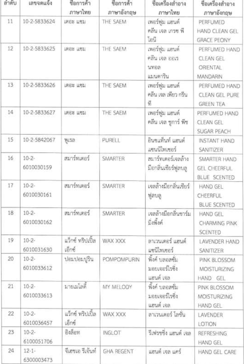 เว็บไซต์ สำนักงานคณะกรรมการอาหารและยา หรือ อย. ได้ประกาศเพิกถอนใบรับจดแจ้งและให้เรียกเก็บคืนผลิตภัณฑ์เจลล้างมือที่มีแอลกอฮอล์ต่ำกว่า 70% โดยปริมาตร จำนวน 24 รายการ เพื่อสร้างความมั่นใจให้กับประชาชนว่า ผลิตภัณฑ์เจลล้างมือแอลกอฮอล์ที่ขายในท้องตลาด จะมีปริมาณแอลกอฮอล์ไม่น้อยกว่า 70%