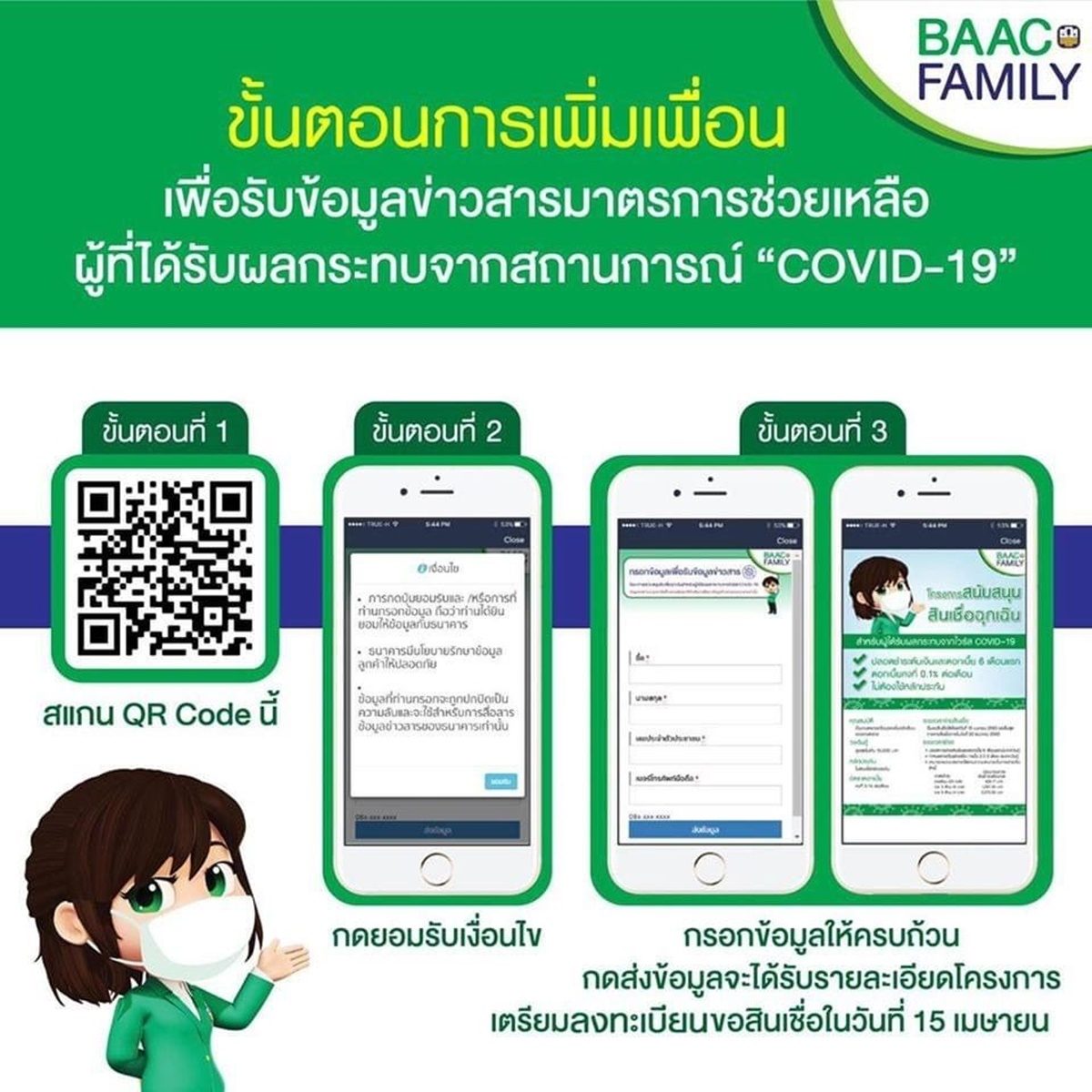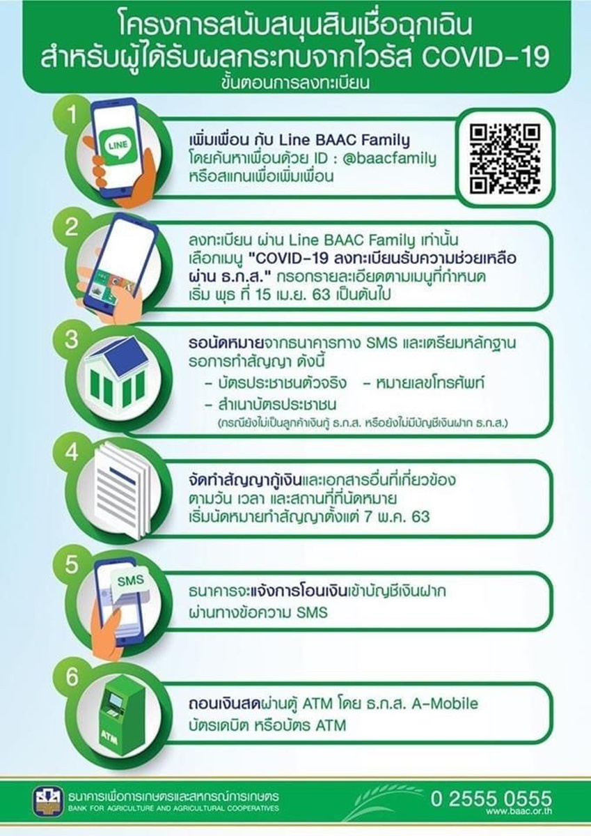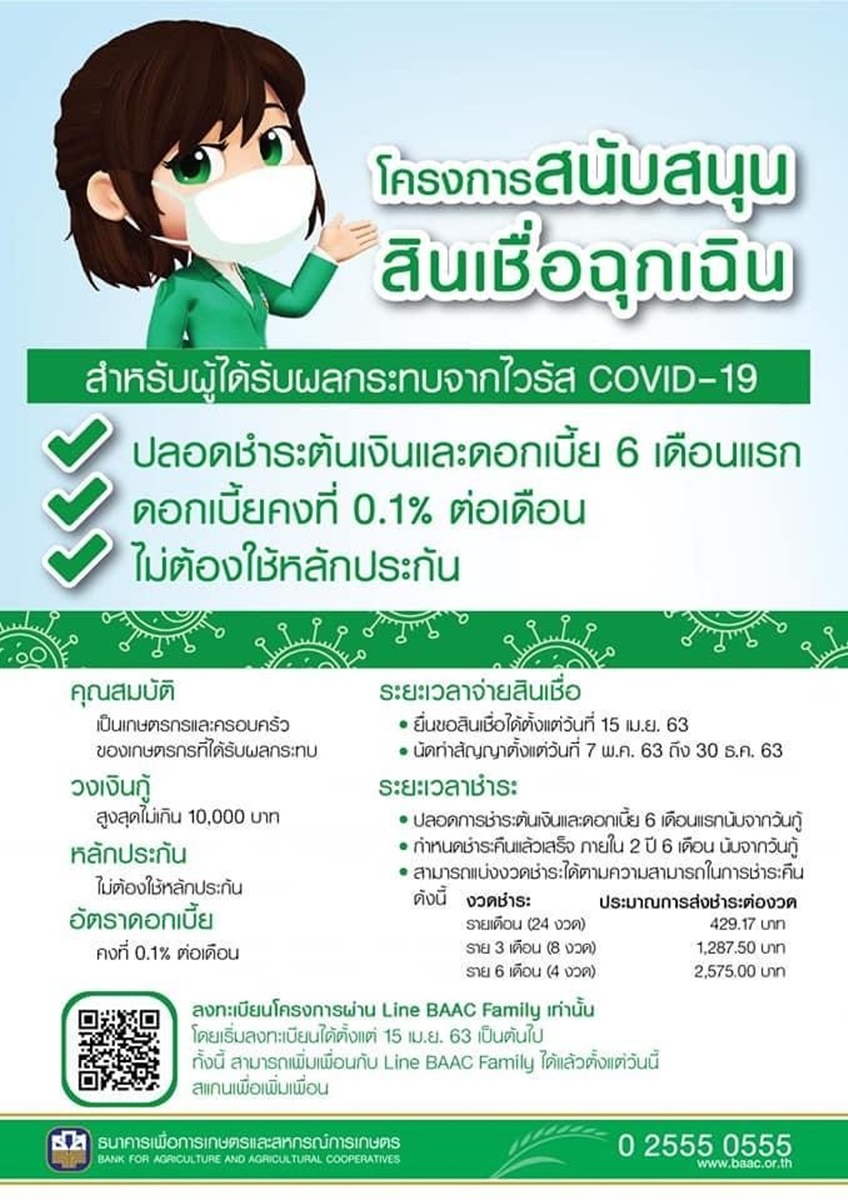 ธ.ก.ส. เปิด “สินเชื่อฉุกเฉิน” สู้ภัยโควิด-19 สำหรับเกษตรกร Journal ข่าวสาร FacebookFacebookXTwitterLINELine เพจ ธ.ก.ส. ได้โพสต์ รายละเอียด โครงการสนับสนุนสินเชื่อฉุกเฉิน เพื่อช่วยบรรเทาภาระค่าใช้จ่ายจำเป็นและฉุกเฉินในครัวเรือน โดยมีกลุ่มเป้าหมาย คือ เกษตรกรและครอบครัวของเกษตรกร ดังนี้ สอบถามข้อมูลเพิ่มเติมได้ที่ โทร. 0-2555-0555 FacebookFacebookXTwitterLINELine