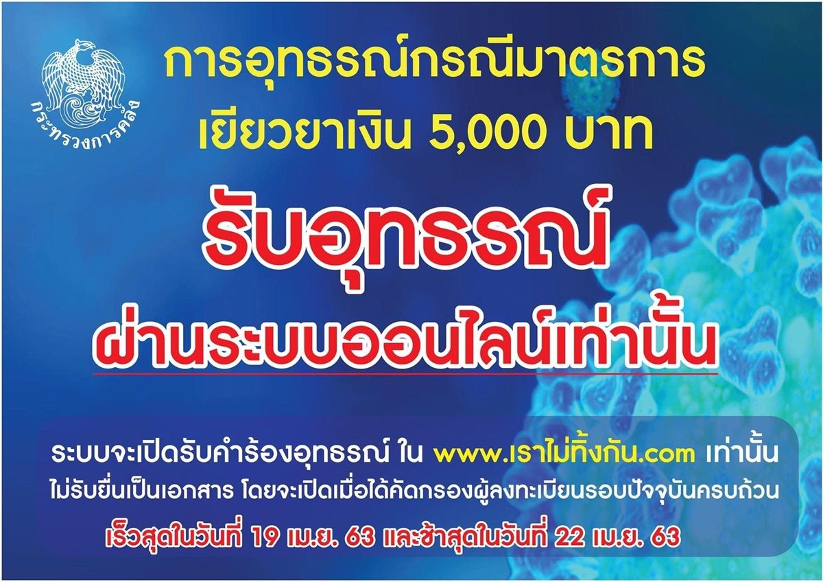 โดยจะเริ่มเปิดให้ดำเนินการเฉพาะทางออนไลน์ ทางเว็บไซต์ “เราไม่ทิ้งกัน” เท่านั้น ในช่วงสัปดาห์หน้า คาดว่าจะประมาณวันที่ 19 เม.ย. 63 เพื่อให้เป็นไปตามมาตรฐานการป้องกันการระบาดโควิด-19 ของกระทรวงสาธารณสุข