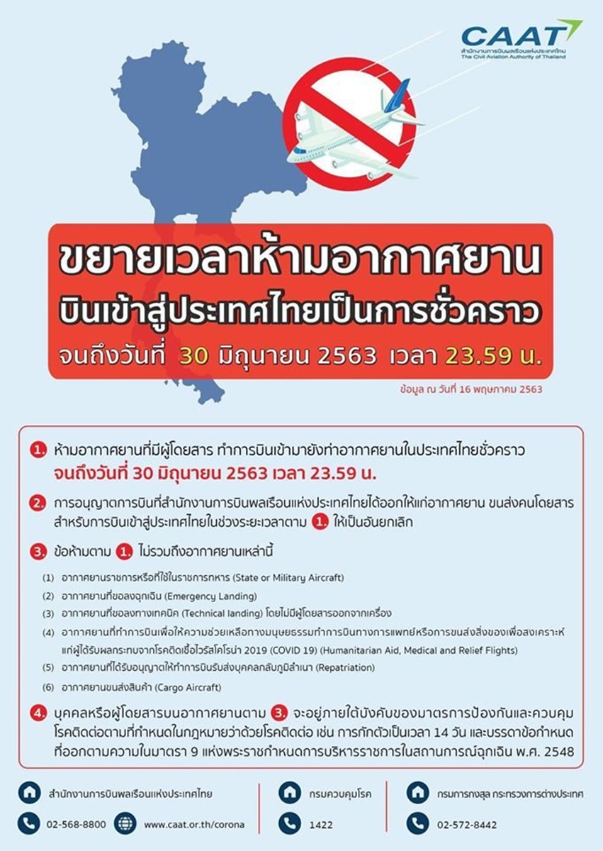 เว็บไซต์ ไทยคู่ฟ้า เผยแพร่ข่าว สำนักงานการบินพลเรือนแห่งประเทศไทย (กพท.) ออกประกาศห้ามอากาศยานขนส่งคนโดยสาร ทำการบินเข้ามายังท่าอากาศยานในประเทศไทยเป็นการชั่วคราว (ฉบับที่ 5) ตั้งแต่วันที่ 1 มิ.ย. 63 เวลา 00.01 น. จนถึงวันที่ 30 มิ.ย. 63 เวลา 23.59 น. (จากเดิมจะสิ้นสุดวันที่ 31 พ.ค. 63 เวลา 23.59 น.)