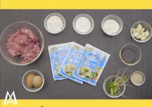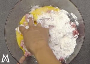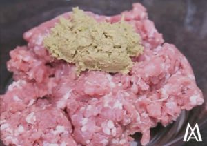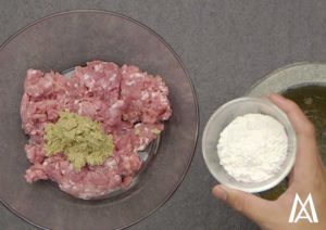 2. นำหมูบดที่เตรียมไว้มาผสมกับรากผักชี, กระเทียม, พริกไทยที่เราโขลกไว้ จากนั้นนำแป้งอเนกประสงค์, ซอสปรุงรส, แป้งทอดกรอบ, แป้งข้าวเจ้า, ไข่ไก่, ผงปรุงรสฟ้าไทย นวดให้ส่วนผสมเข้ากัน หมักไว้ประมาณ 10 นาที