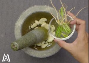 1. นำรากผักชี กระเทียม พริกไทย โขลกให้ละเอียด