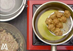 3. เตรียมหม้อด้ามตั้งน้ำมันให้ร้อน นำหมูปั้นเป็นก้อนกลม กดให้แบนเล็กน้อย ลงทอดน้ำมันท่วม ใช้ไฟกลาง จนกระทั่งหมูสุก นำขึ้นพักไว้ให้สะเด็ดน้ำมัน จัดเสิร์ฟโรยด้วยกระเทียมเจียว เคียงด้วยซอสพริก