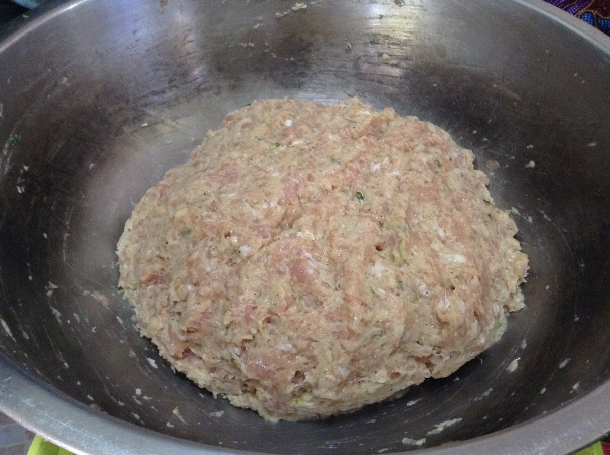 เทส่วนผสมทุกอย่างและนวดให้ส่วนผสมเข้ากัน จากนั้นหยิบไส้ขนมจีบที่ผสมเรียบร้อย ห่อใส่ใบเกี๊ยว “การห่อขนมจีบ ต้องแตะน้ำมันเล็กน้อย แล้วจับจีบเป็นลูก จึงจะสวย น่าทาน”