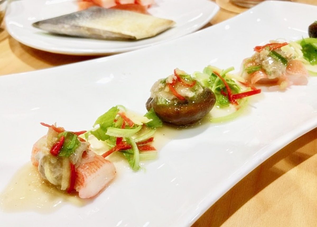 นวดเข้าที่แล้วนำไปเกาะเห็ดหอมแห้งที่แช่น้ำไว้จนนุ่ม หรือ เกาะปูอัด เกาะบร็อกโคลี่ ข้าวโพดอ่อน เวลาเกาะให้เอานิ้วแตะน้ำเล็กน้อย แตะผิวหมูมันจะเรียบสวยไม่ขรุขระ เกาะเสร็จใส่ในถ้วยเล็กโรยด้วยพริกแดงหั่นเส้น ผมใช้พริกแดงจินดา เผ็ดกว่าพริกชี้ฟ้า สะใจกว่า ขึ้นฉ่ายหั่นเส้น และขิงซอย นึ่งไปพร้อมกัน 5 นาทีสุกกินได้เลย