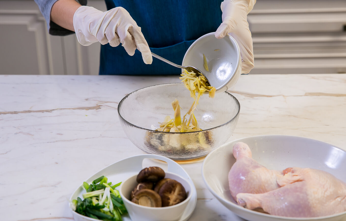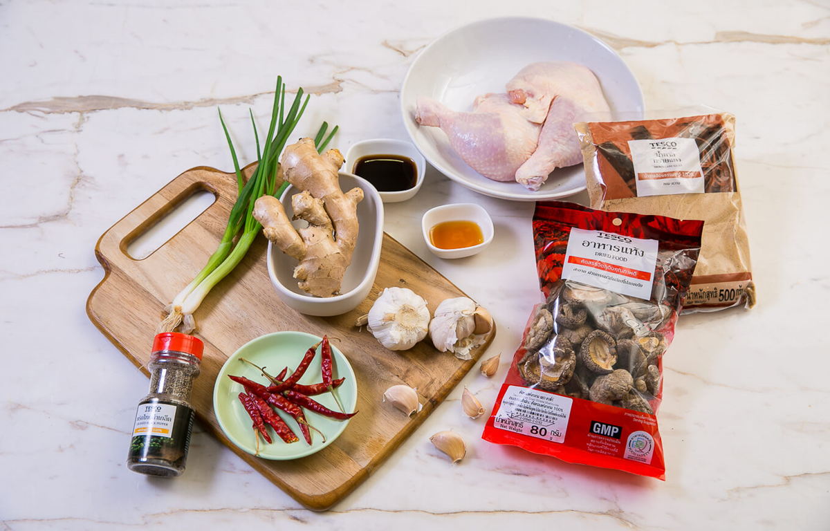 นำซีอิ๊วขาวเห็ดหอม น้ำตาลทรายแดง น้ำมันงา กระเทียม ขิงอ่อน พริกไทยดำ พริกแห้ง และน่องไก่ติดสะโพก มาคลุกเคล้าให้เข้ากัน แล้วพักทิ้งไว้ 3 นาที