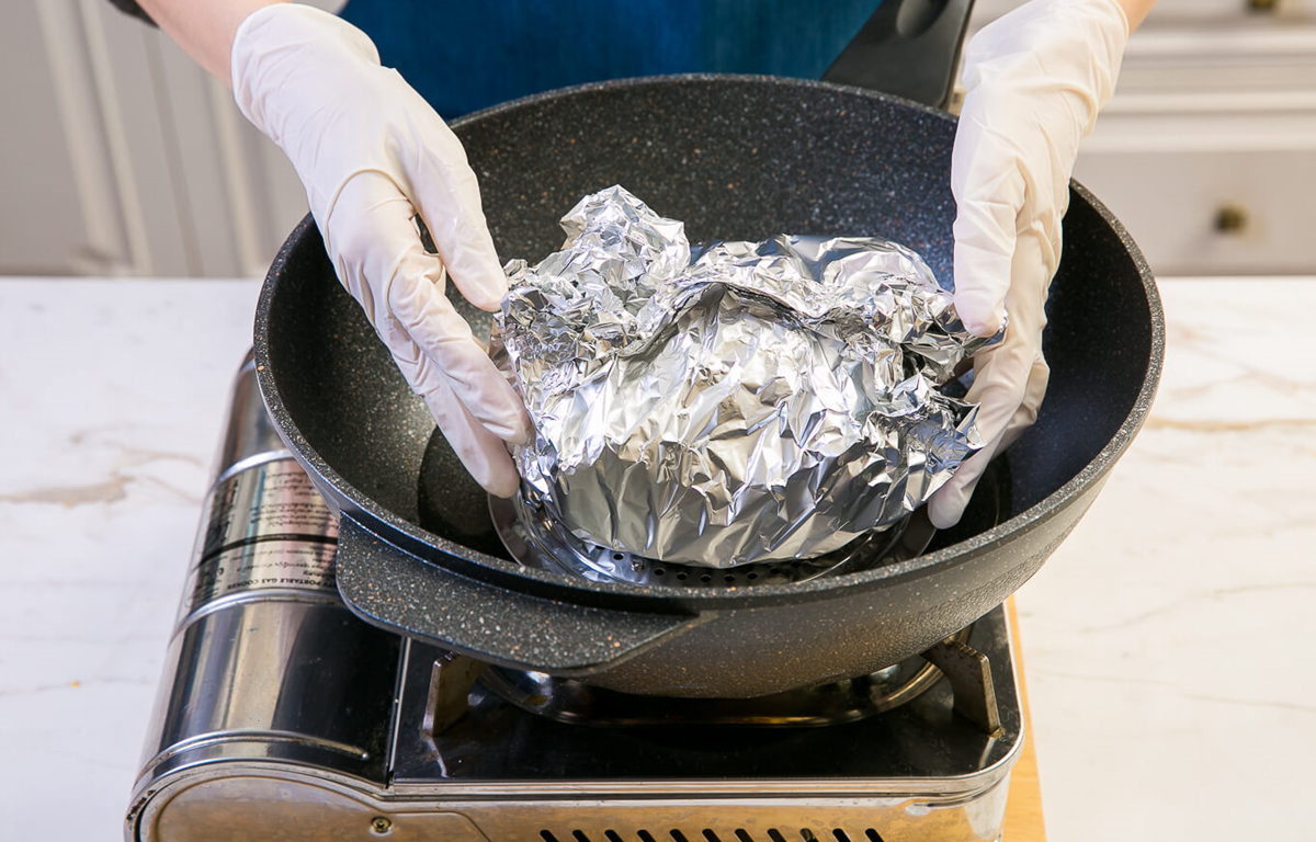 ตั้งกระทะสำหรับนึ่ง โดยวางตะแกรงรองนึ่งบนกระทะ แล้วเติมน้ำลงไปในกระทะ จากนั้นนำฟอยล์ที่ปิดสนิทแล้ววางบนตะแกรง ตั้งไฟ นึ่งประมาณ 25-30 นาที
