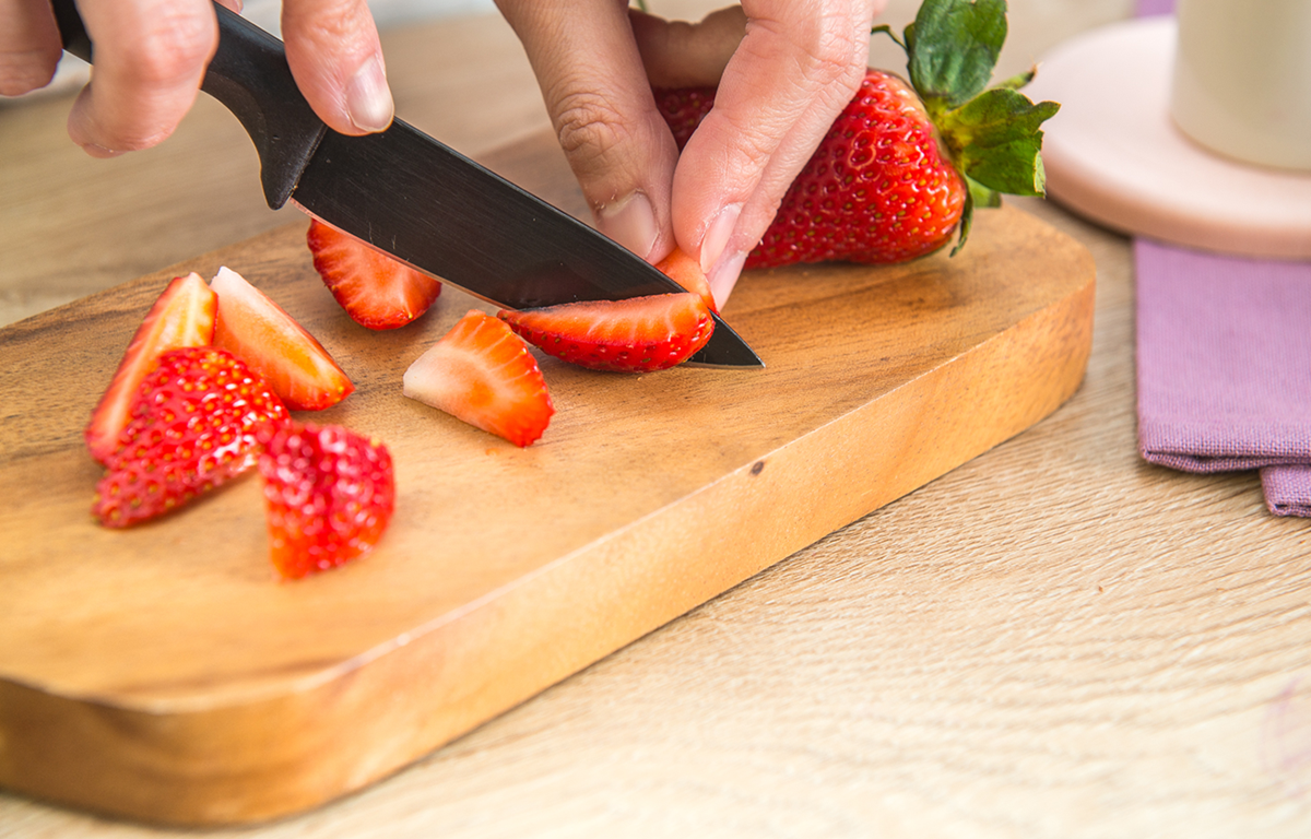 นำสตรอว์เบอร์รีสด มาหั่นเป็นชิ้นเล็กๆ แล้วนำไปแช่แข็ง