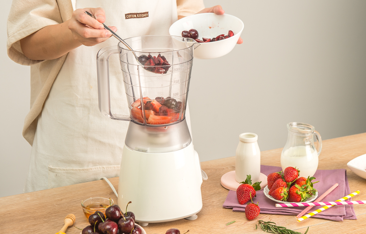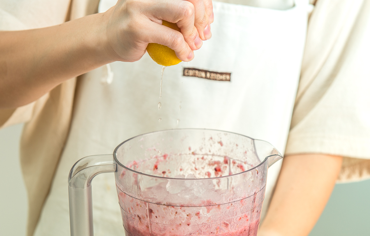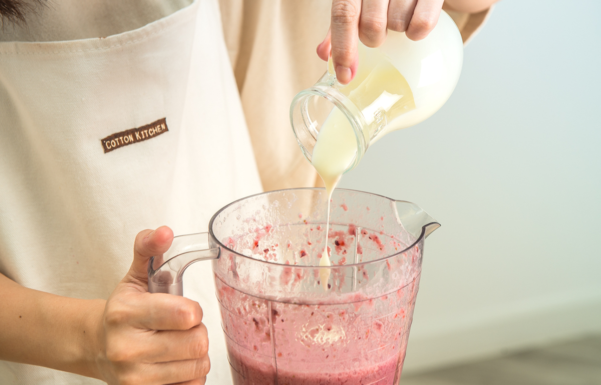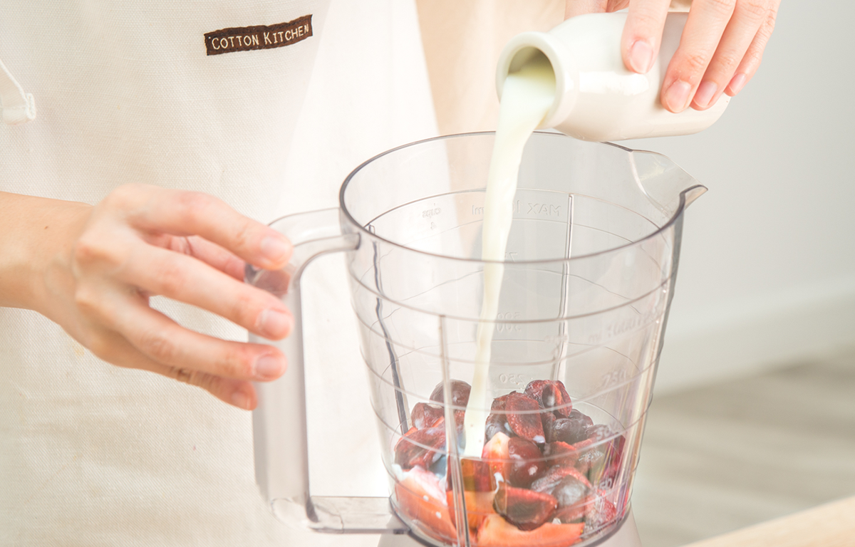เมื่อเชอร์รีและสตรอว์เบอร์รีเย็นได้ที่แล้วนำไปใส่เครื่องปั่นเทนมผสมลงไป