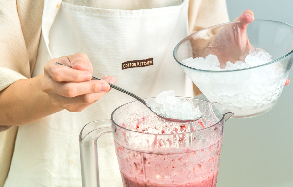 ปั่นส่วนผสมทั้งหมดให้เข้ากัน จากนั้นเทน้ำแข็งลงไปในเครื่องปั่น แล้วปั่นให้ส่วนผสมและน้ำแข็งเป็นเนื้อเดียวกัน