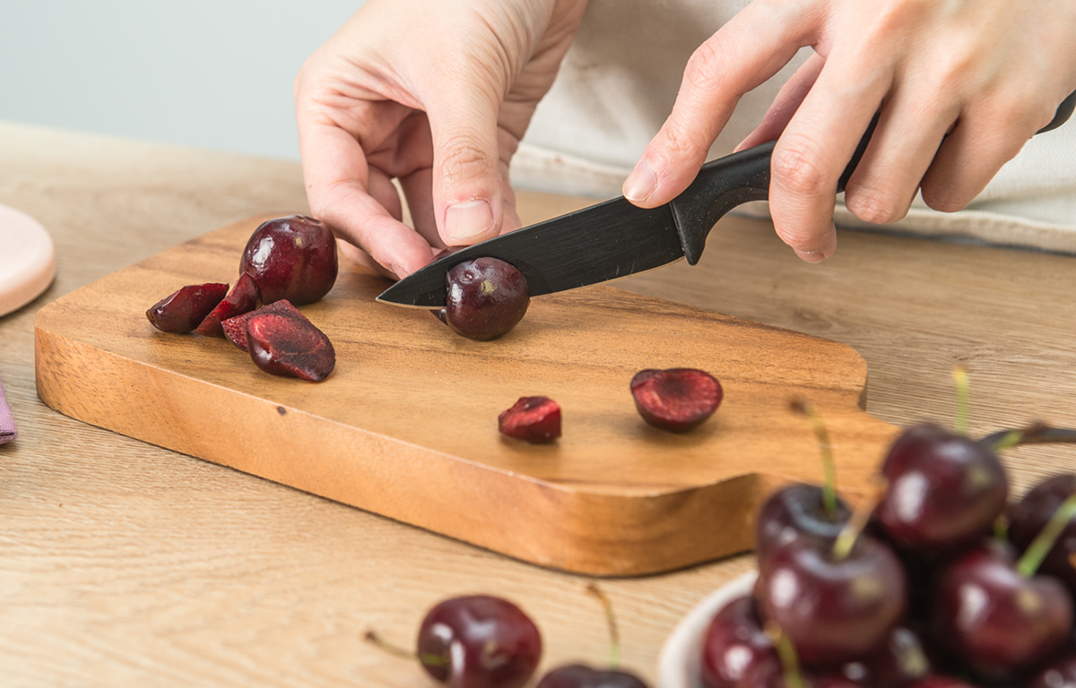 นำเชอร์รีมาคว้านเมล็ดออกแล้วหั่นเป็นชิ้นเล็กกำลังดีแล้วนำไปแช่เย็น