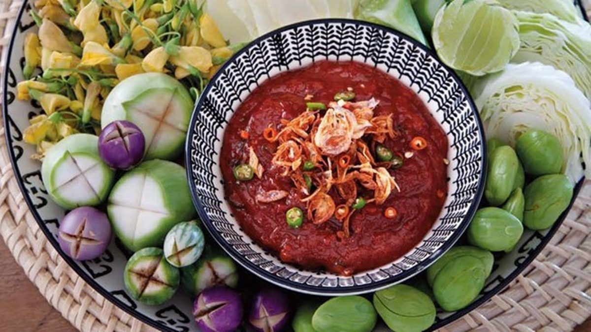 เริ่มครกแรก “น้ำพริกเต้าเจี้ยว” นั้น ท่านให้ใช้ “เต้าเจี้ยว” แทนกะปิ โดยเต้าเจี้ยวที่ใช้ตำน้ำพริกครกนี้ควรเป็นเต้าเจี้ยวญี่ปุ่นที่เรียกว่า “มิสโซรุ” ซึ่งรสออกจะดีกว่าเต้าเจี้ยวจีน เลือกเอาอย่างที่มีส่วนค่อนข้างดำและแห้ง ไม่เปียกน้ำ วิธีทำเริ่มด้วยการโขลกกุ้งแห้งกับกระเทียม แล้วเติมเต้าเจี้ยวลงไปโขลกให้เข้ากัน จากนั้นใส่พริกชี้ฟ้า พริกขี้หนู โขลกพอบุบๆ ใส่มะอึกหรือมะดันถ้ามี พอเข้ากันดีแล้วก็ปรุงรสด้วยมะนาว น้ำตาลปึก ส่วนน้ำปลากับเกลืออาจจะไม่จำเป็นเพราะเต้าเจี้ยวเค็มอยู่แล้ว น้ำพริกครกนี้รับประทานกับมะเขือยาวเผา จะมีผักสดเติมอีกนิดหน่อย ก็ได้ เช่น ยอดผักบุ้ง มะเขือเปราะ และขมิ้นขาว ส่วนปลาเครื่องแนมนั้น ใช้ปลาดุกย่างทอด หรือจะเป็นปลาช่อน หรือปลาอื่นๆ ที่มีเนื้อมากๆ ทอดให้ฟูก็ได้เช่นกัน