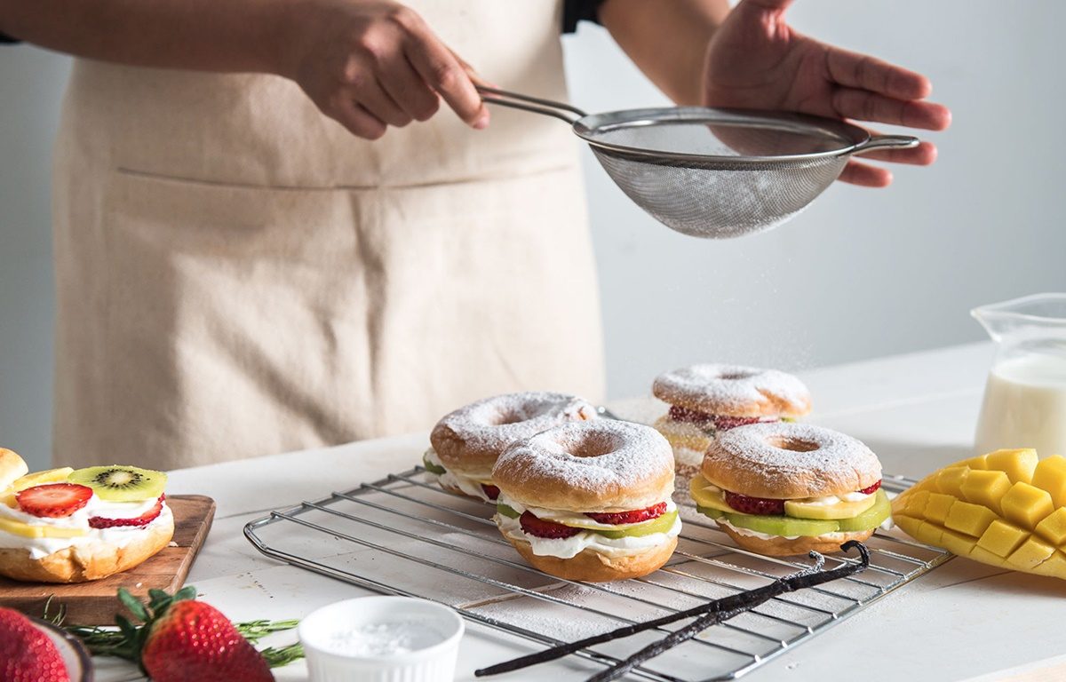- เมื่อทำโดนัทครีมสดผลไม้ครบตามจำนวนชิ้นแล้ว ให้โรยน้ำตาลไอซิ่งผ่านกระชอน เพื่อตกแต่งหน้าโดนัทให้สวยงาม เพียงเท่านี้ก็พร้อมเสิร์ฟได้เลย!