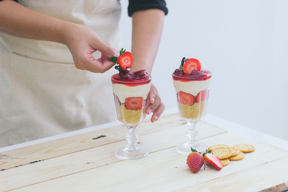 - หั่นสตรอว์เบอร์รีสดโดยฝานเป็นชิ้นบางๆ จากนั้นนำชิ้นสตรอว์เบอร์รีวางเรียงชิดขอบแก้วที่ใส่แครกเกอร์ไว้