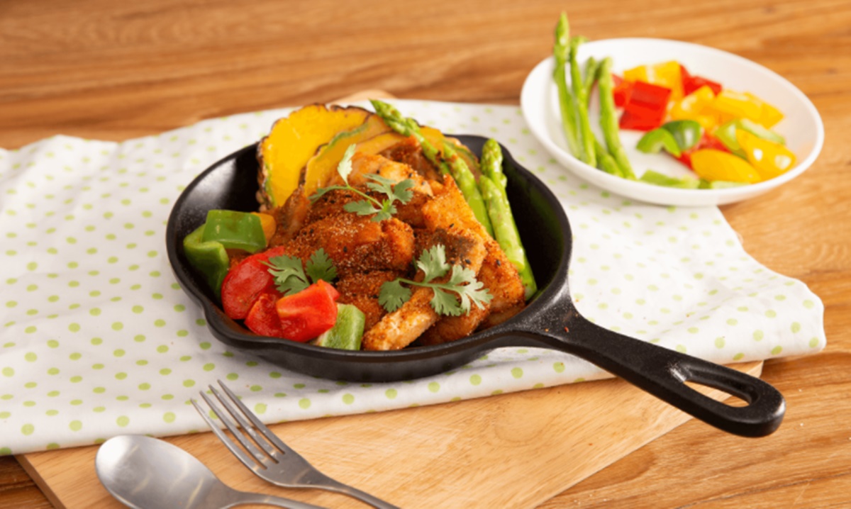 4. นำพริกหยวกยักษ์ หน่อไม้ฝรั่ง ฟักทองหั่นเป็นชิ้นๆ พอดีคำ แล้วนำไปจี่ในกระทะ พอสุกก็นำจัดใส่จานให้สวยงามเพิ่มความน่าทาน