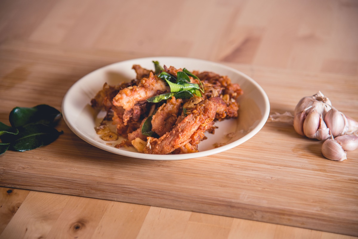 3. นำใบมะกรูดทอดกรอบ หอมแดงซอยเจียว และกระเทียมซอยเจียวที่เตรียมไว้ โรยหน้าบนจานหมูทอด เท่านี้ก็อร่อยเพลินเกินห้ามใจ